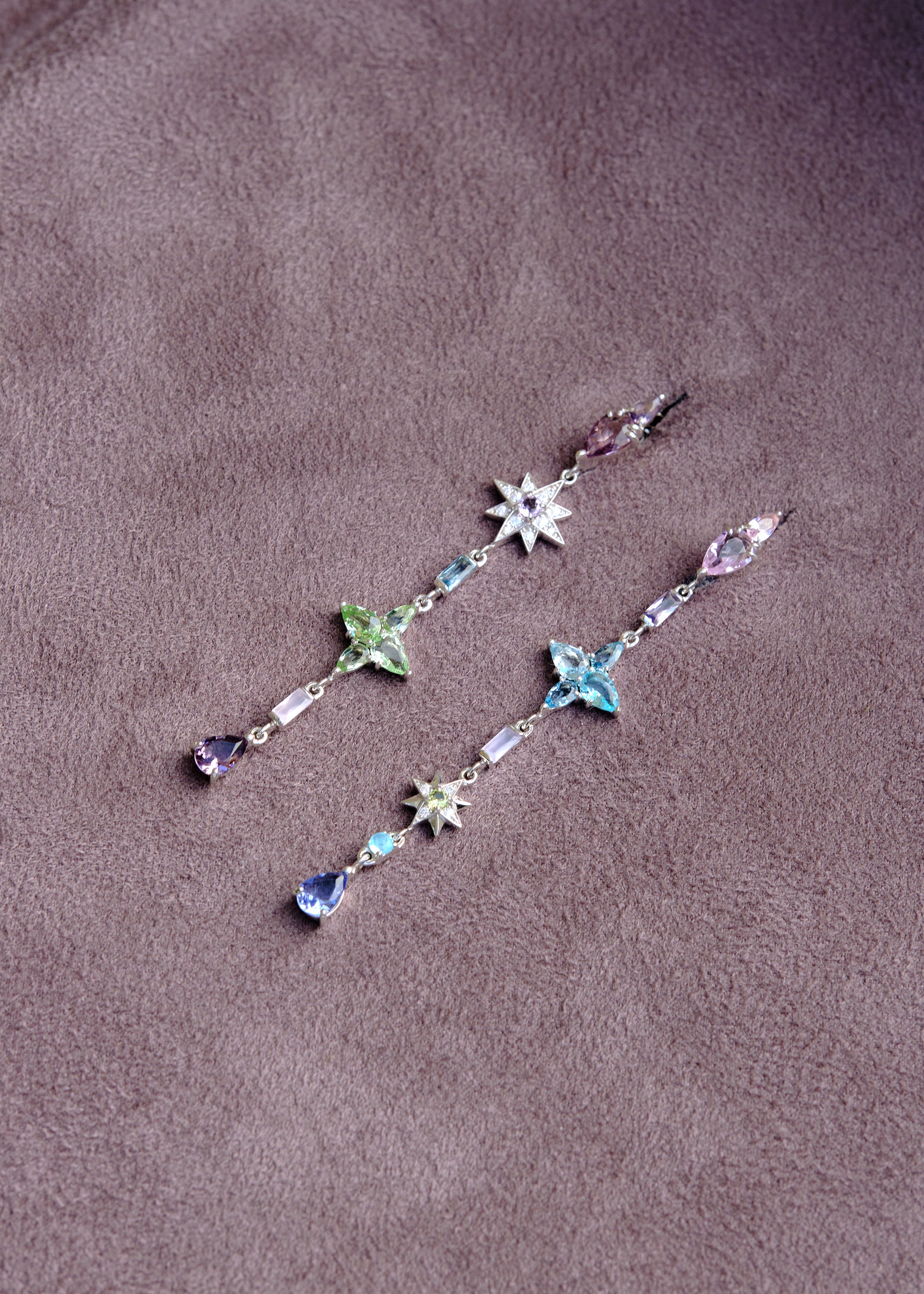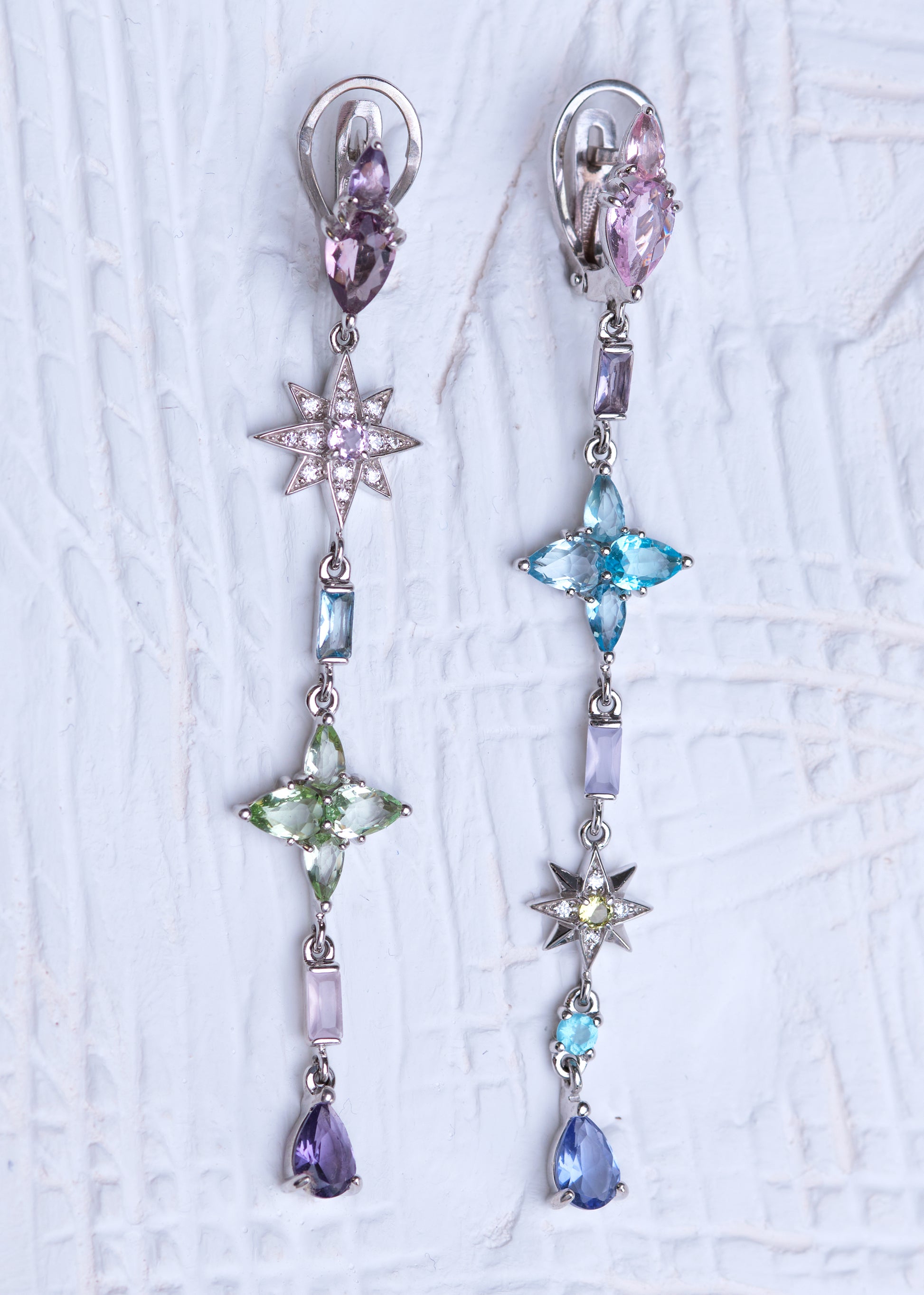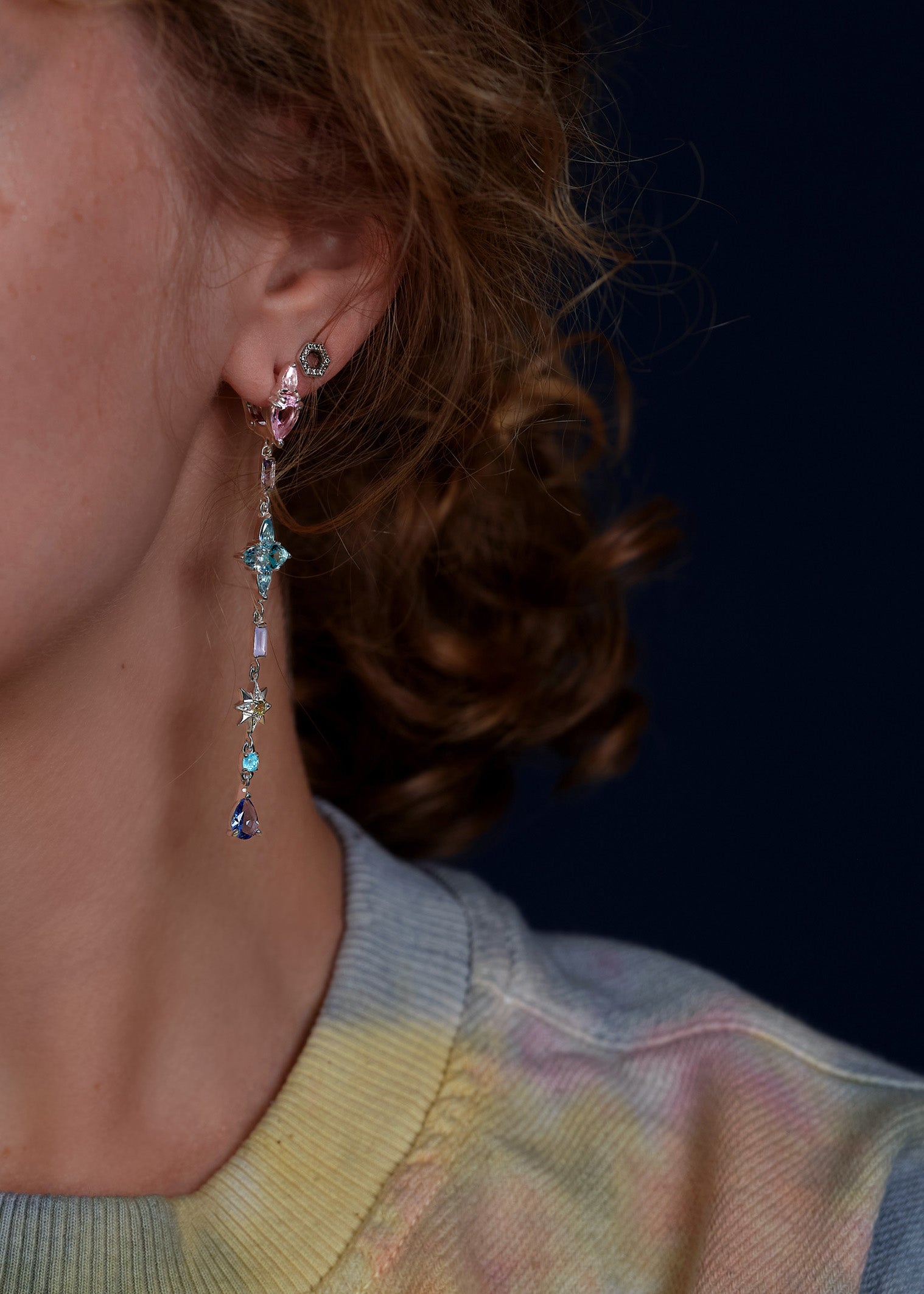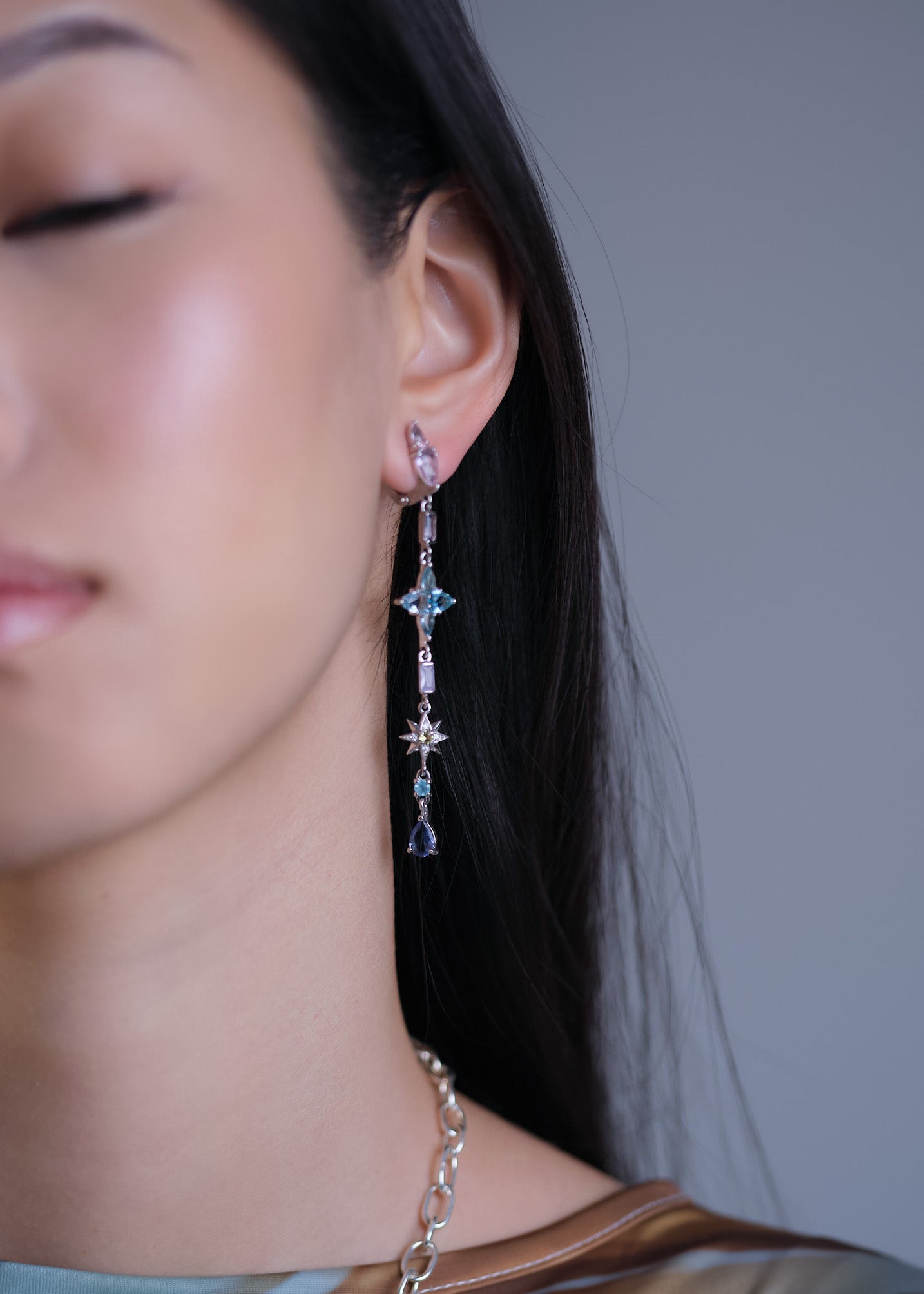 Asymmetrical, movable earrings crafted from 925 sterling silver, plated with platinum and rhodium to protect against oxidation.