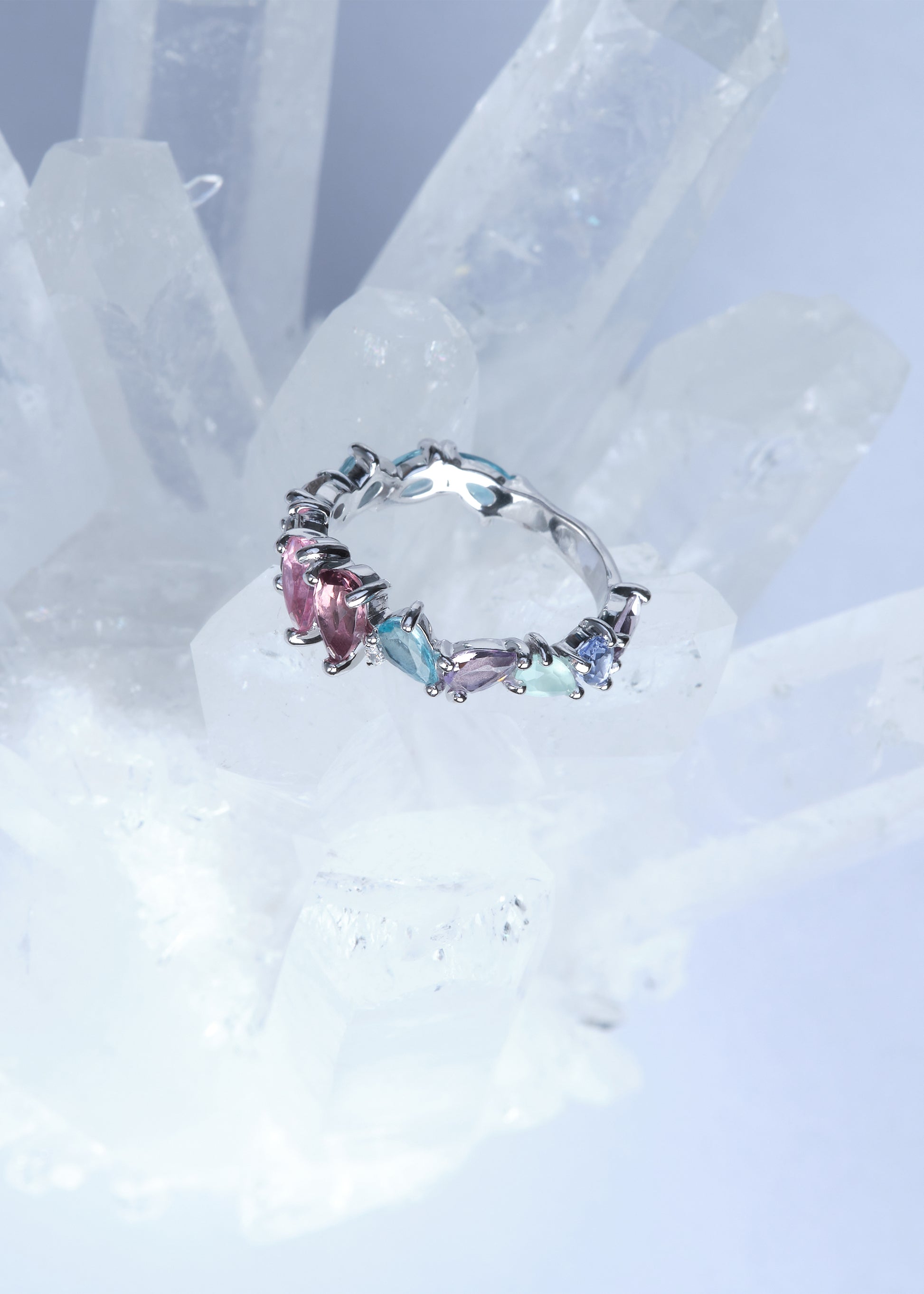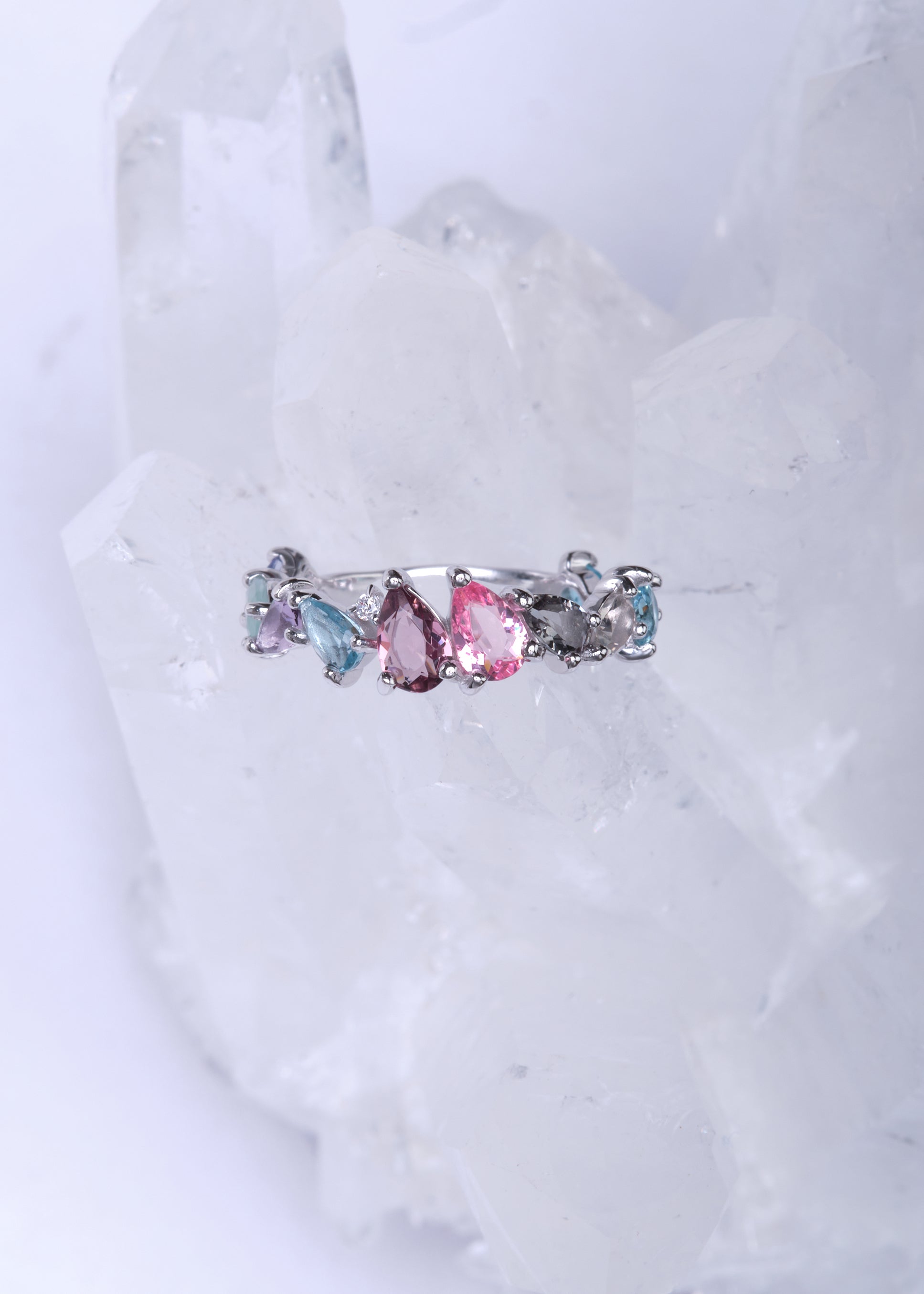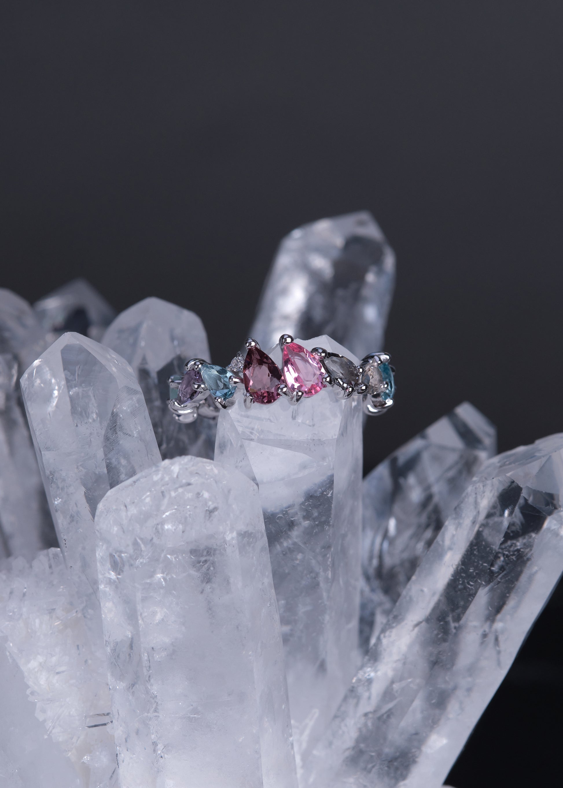 Pear-cut stones in various colors are set like a watercolor painting, and a single small sparkling cubic zirconia reflects our love for detail.