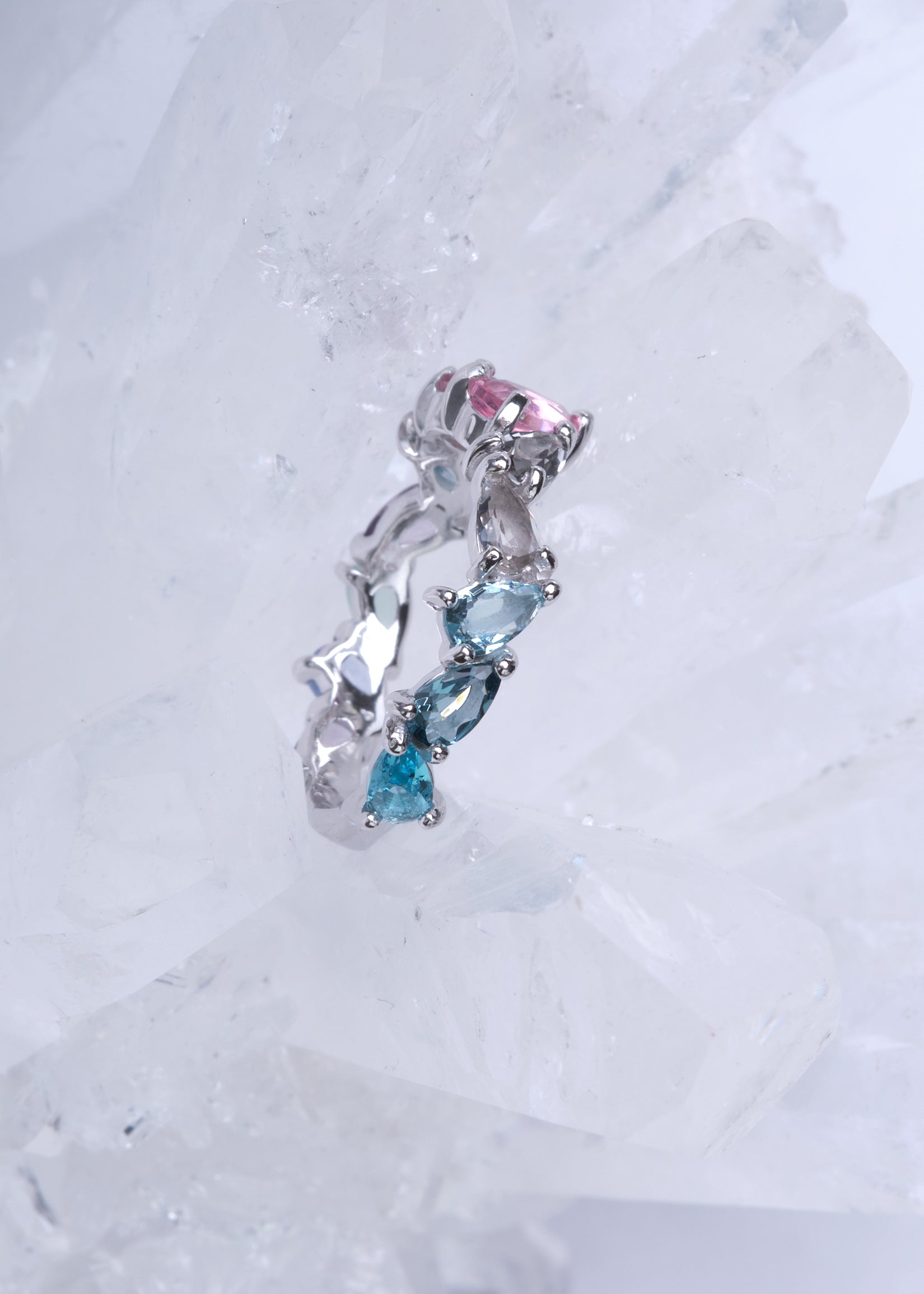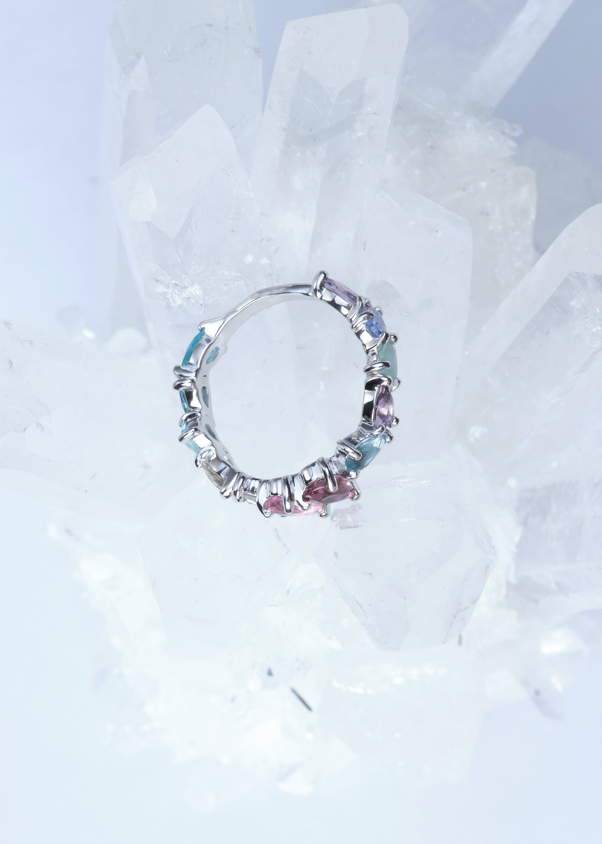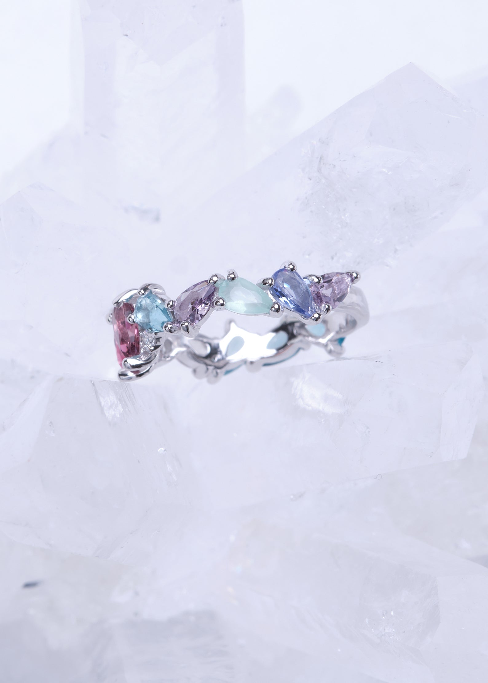 Pear-cut stones in various colors are set like a watercolor painting, and a single small sparkling cubic zirconia reflects our love for detail.