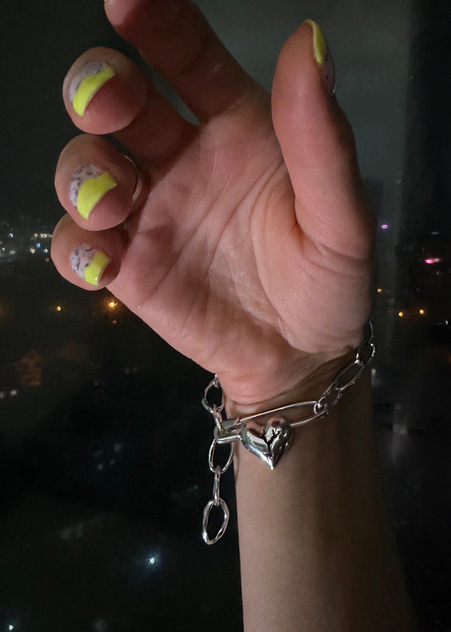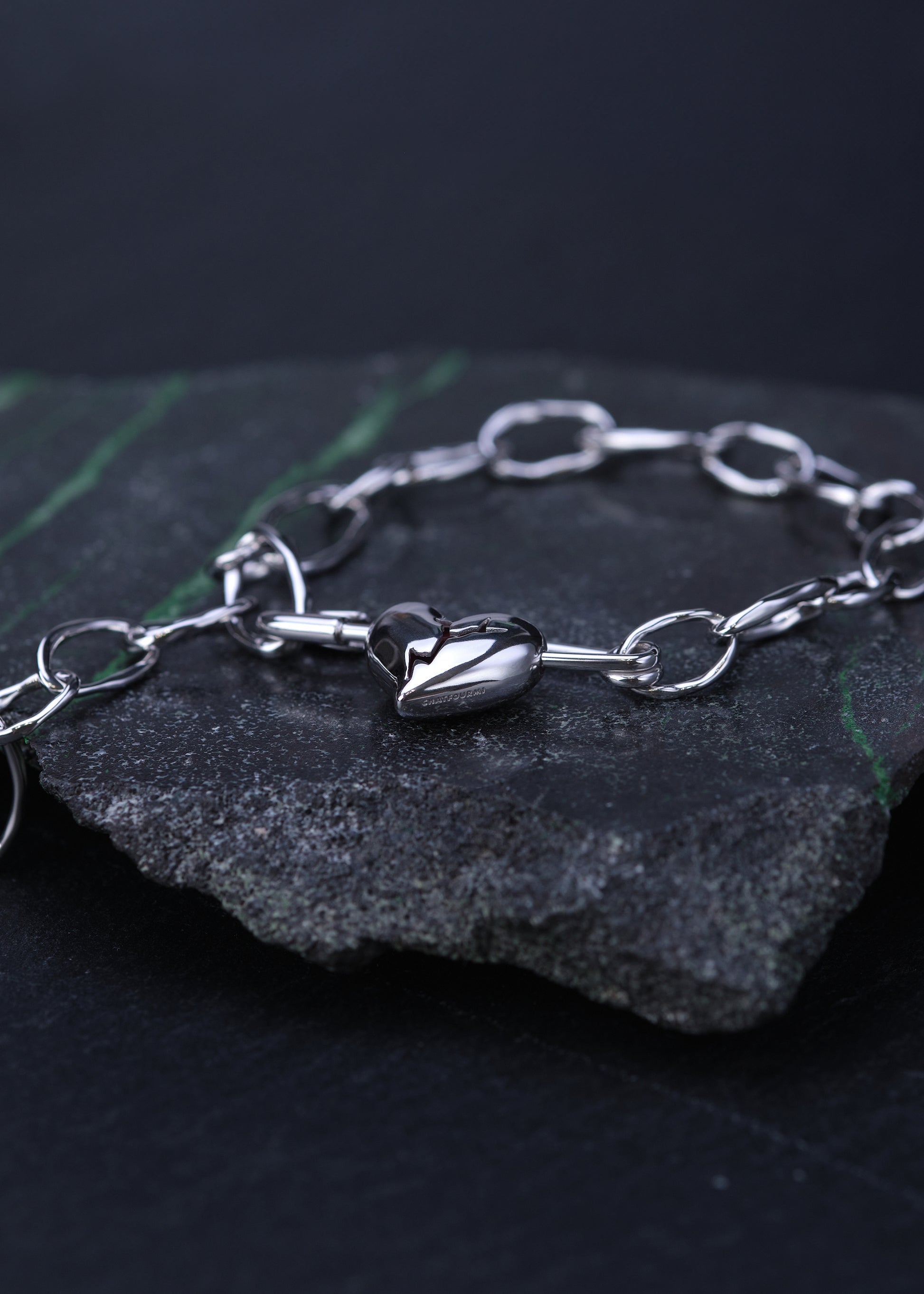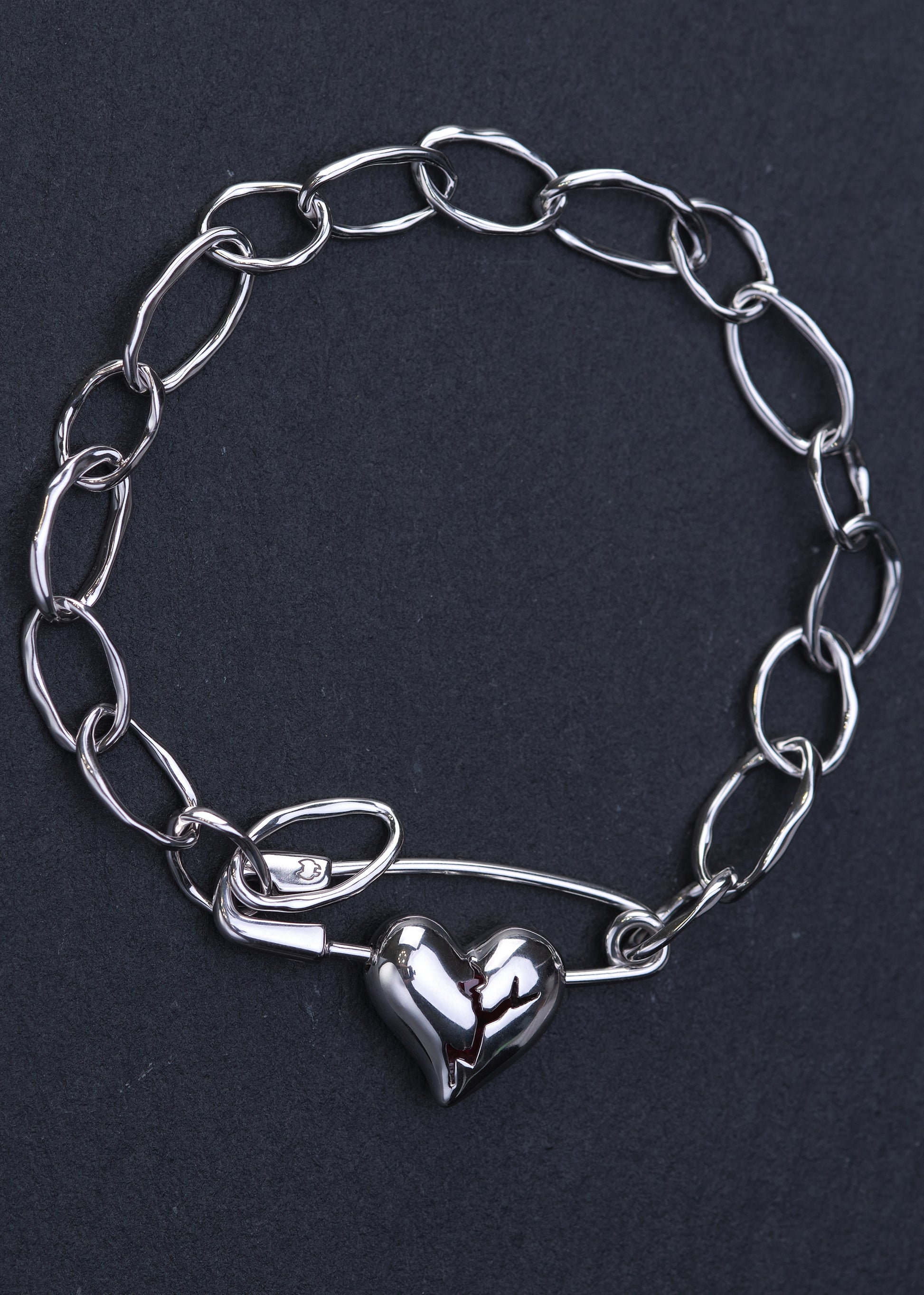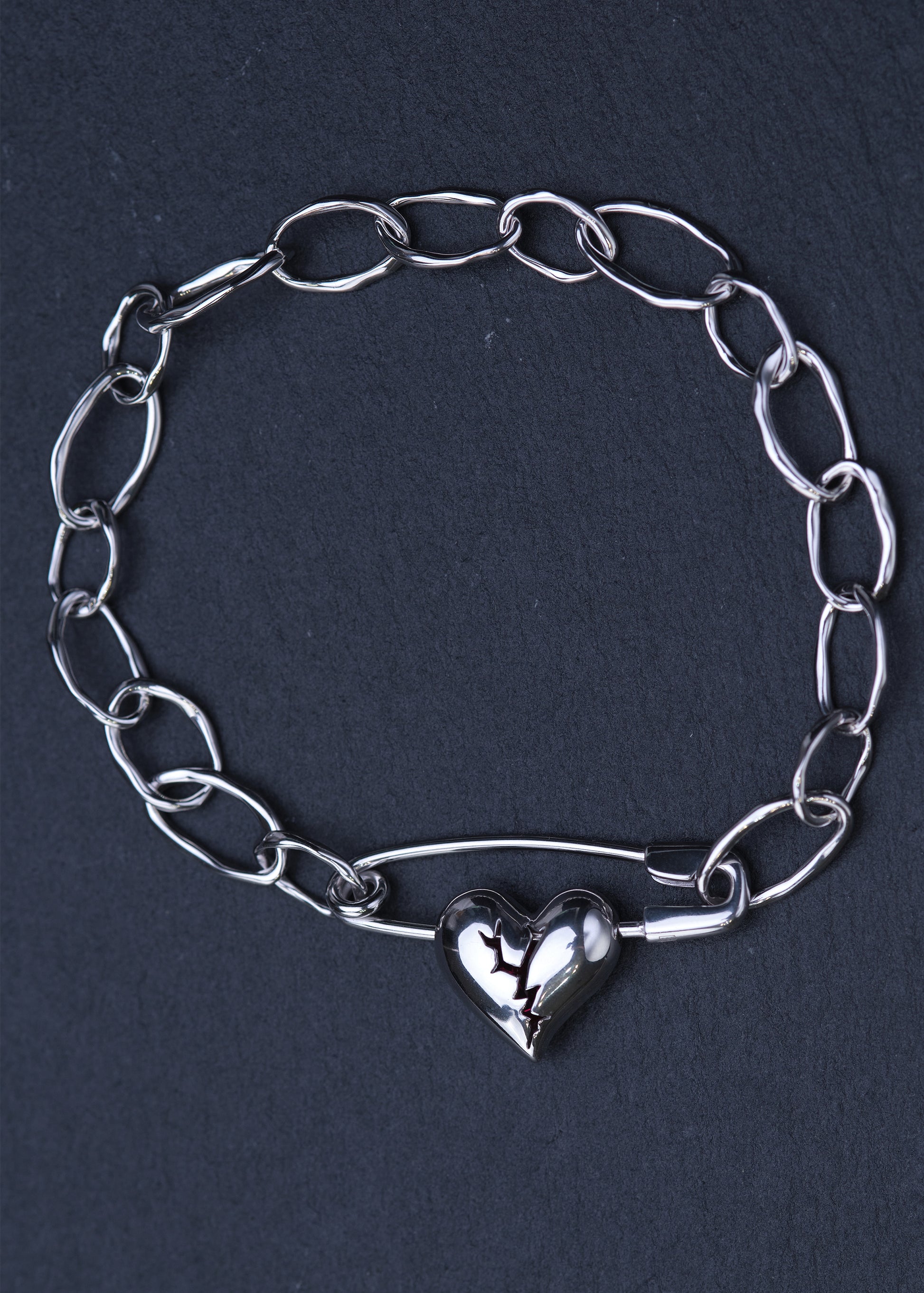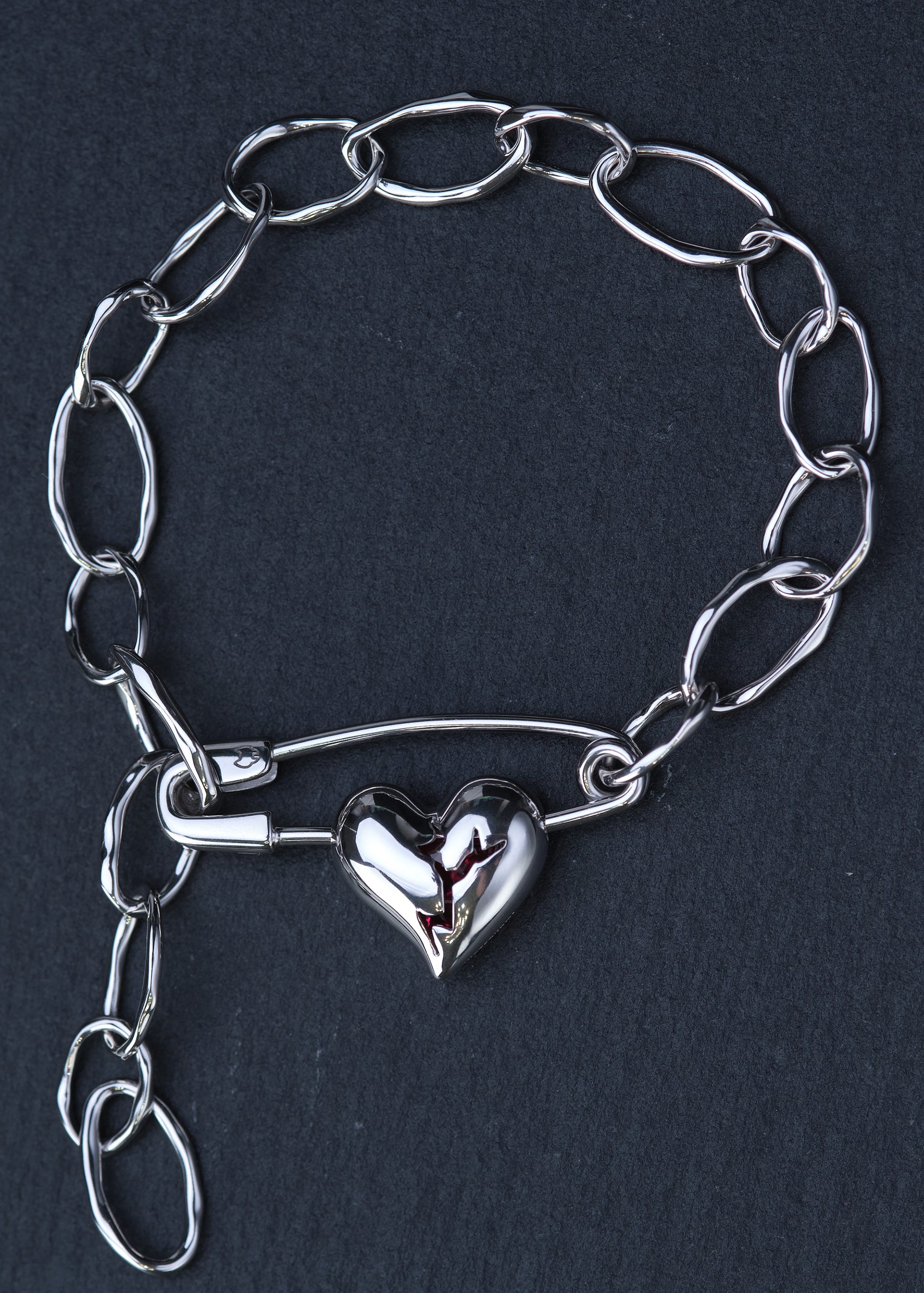 A broken heart with a large synthetic ruby inside, pierced by a pin – an ironic quintessence of drama.