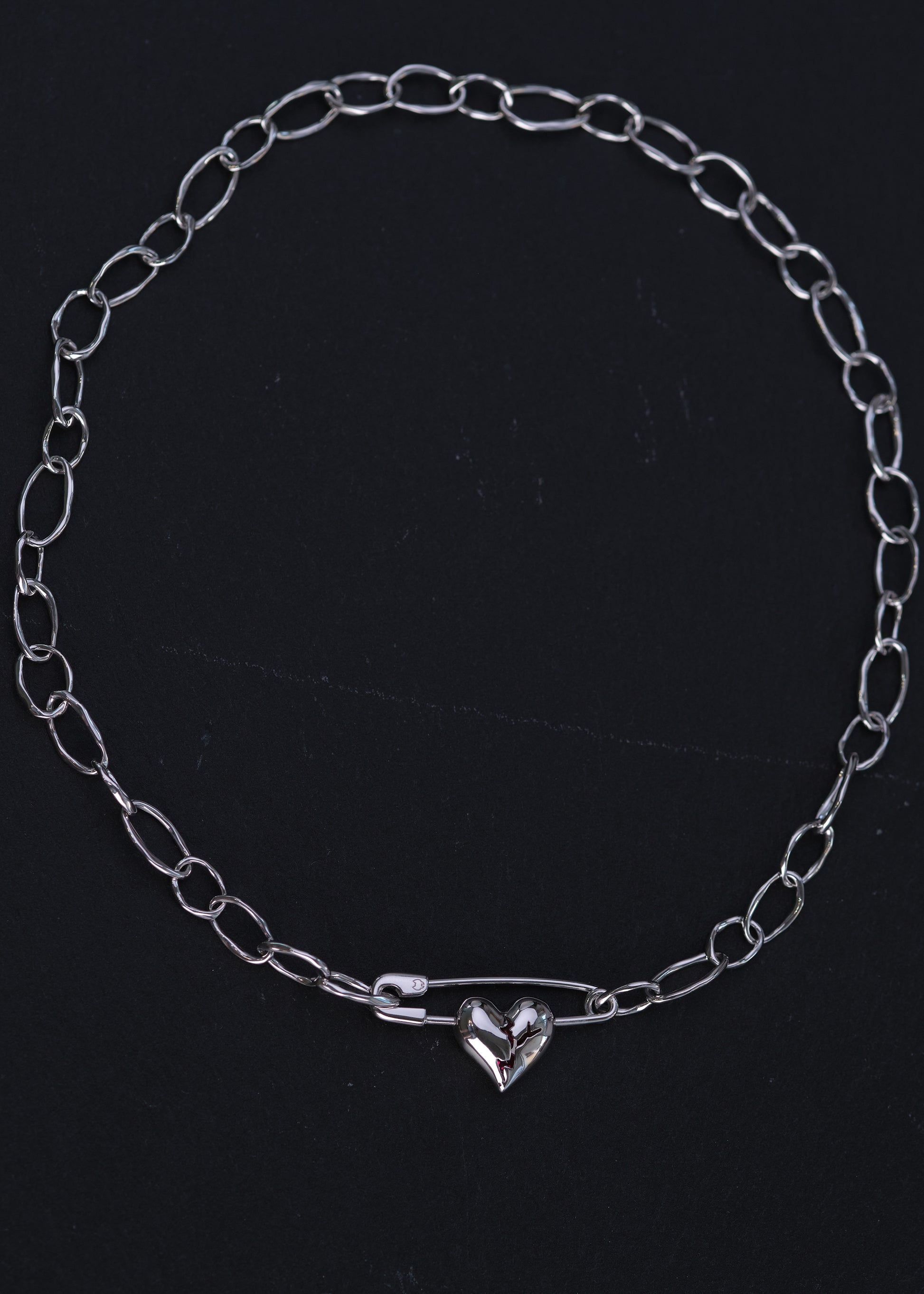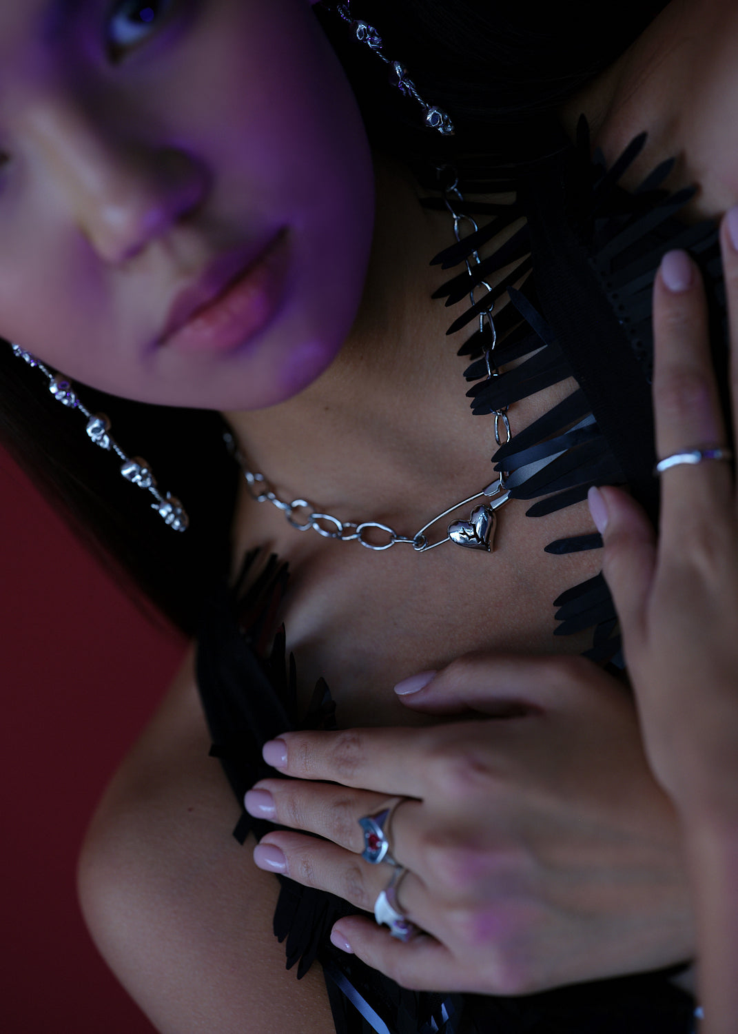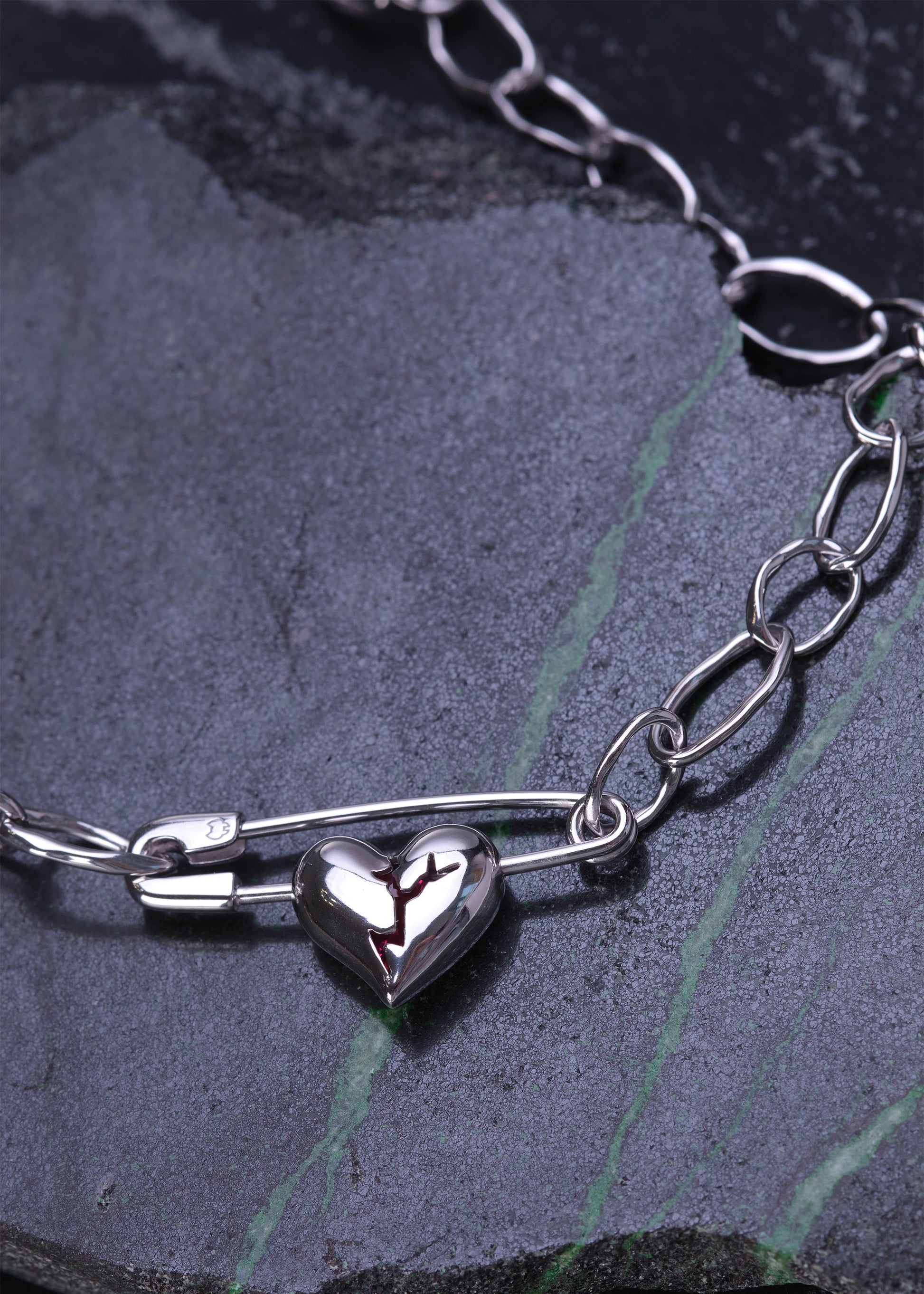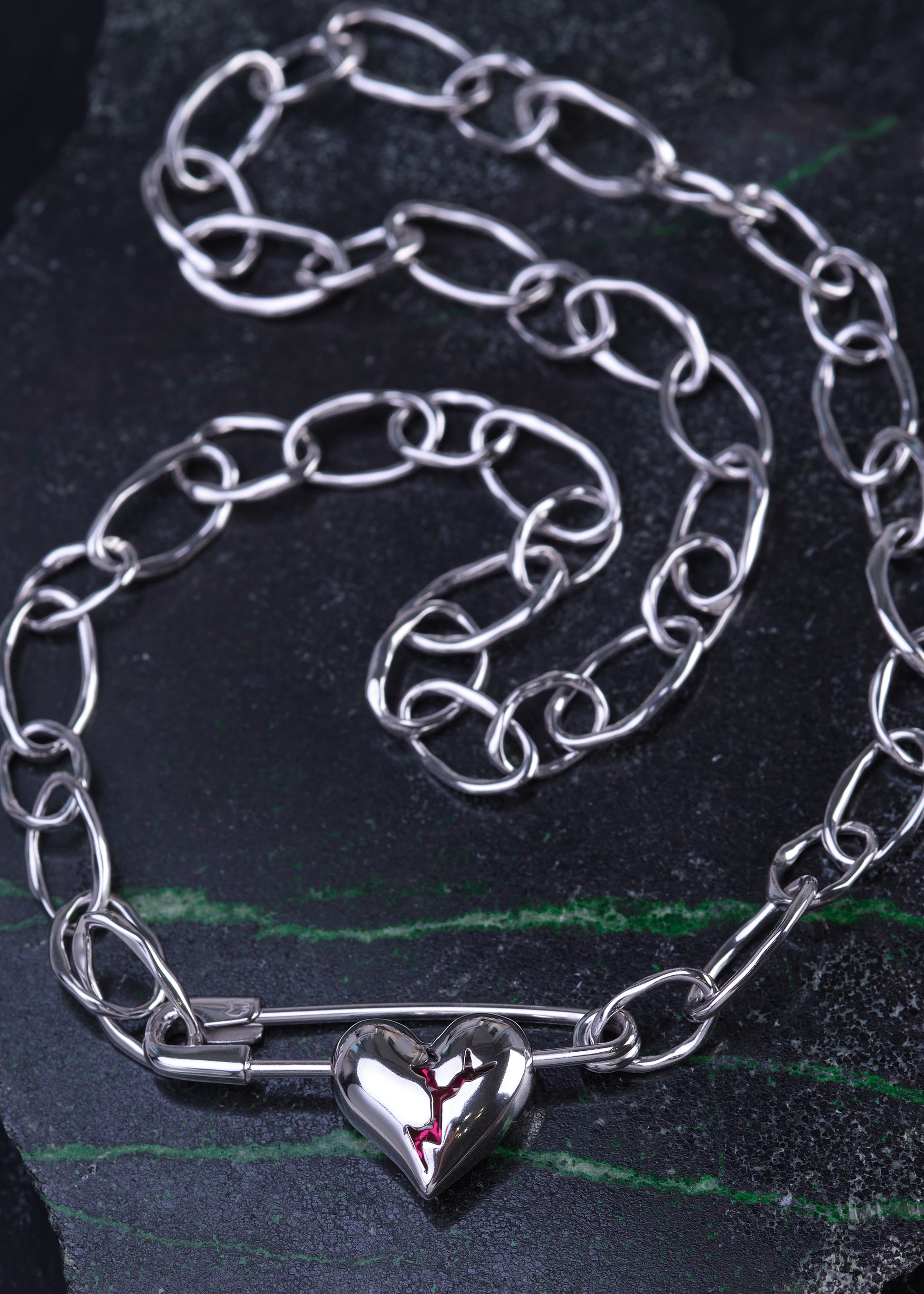 A broken heart with a large synthetic ruby inside, pierced by a pin – an ironic quintessence of drama.