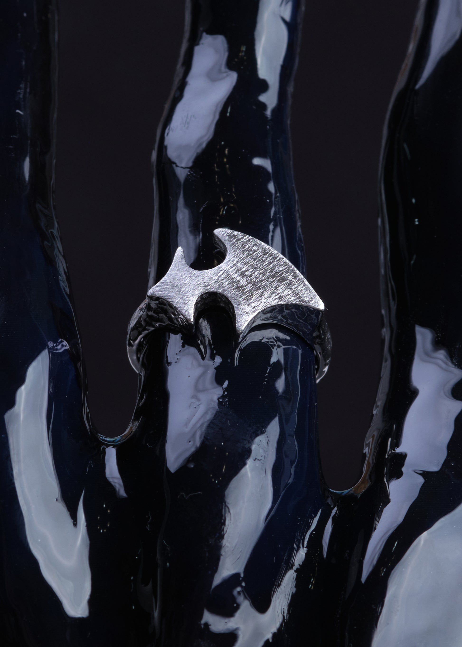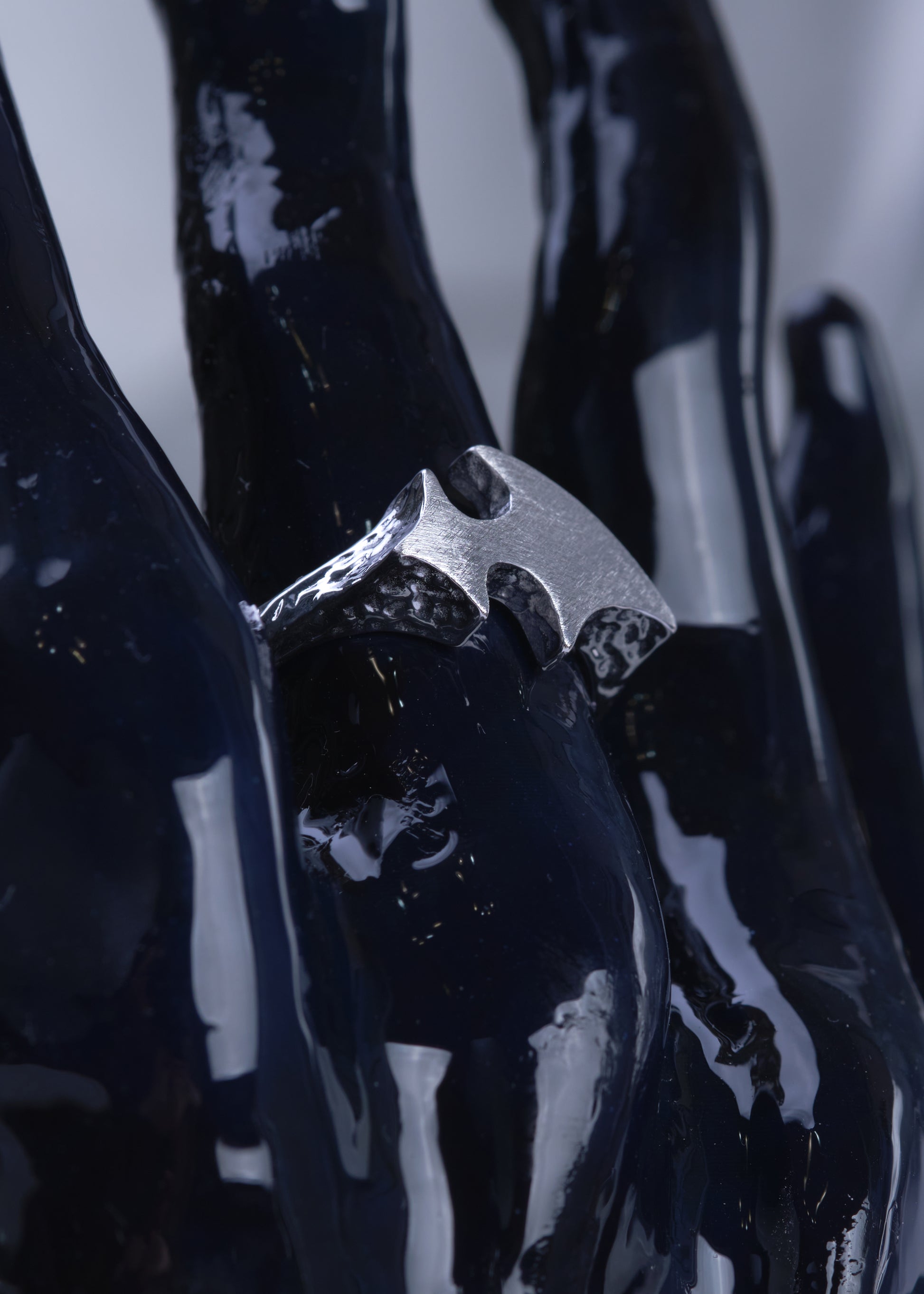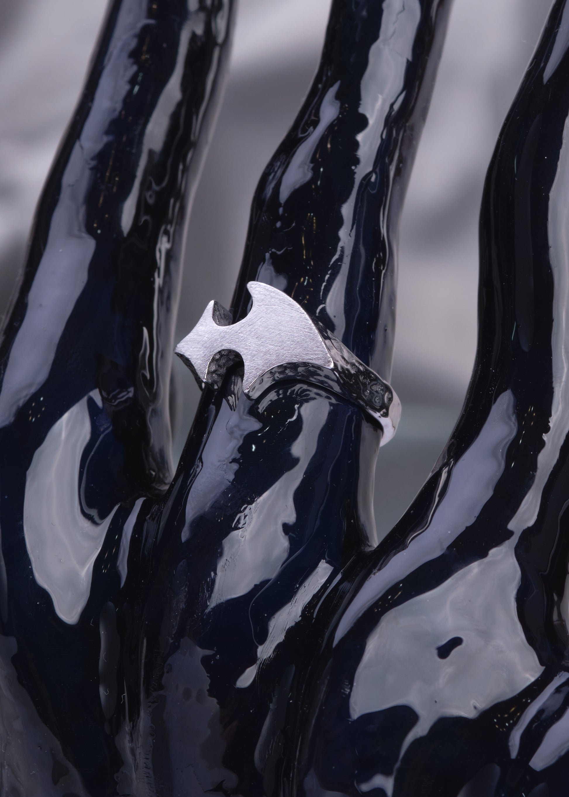 The shape of this signet type ring is retrieved from a medieval European battle axe. Those days weapons were such a big part of human lives so they were created as beautiful as jewelry. Artists and craftsmen worked on exquisite shapes and ornaments for axes and knives. We decided to use some of their effort and transform a beautiful axe shape it into something peaceful. So this is our Make Jewelry Not War statement.