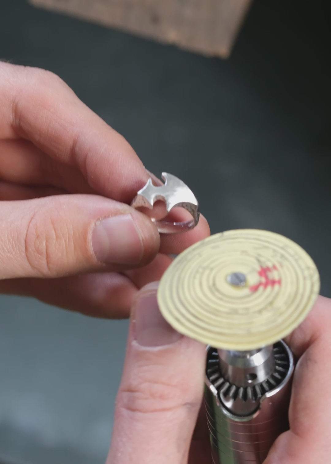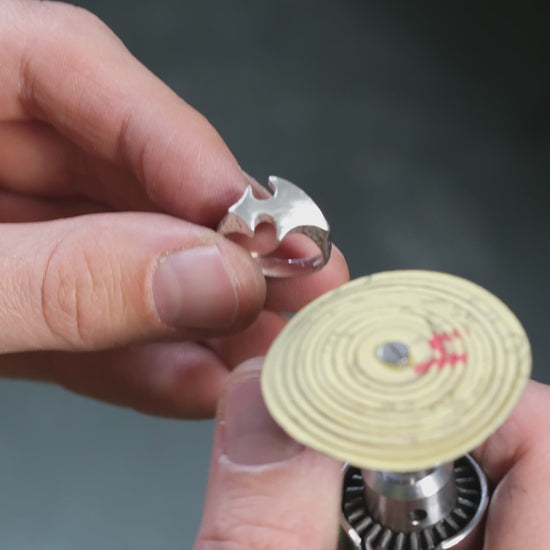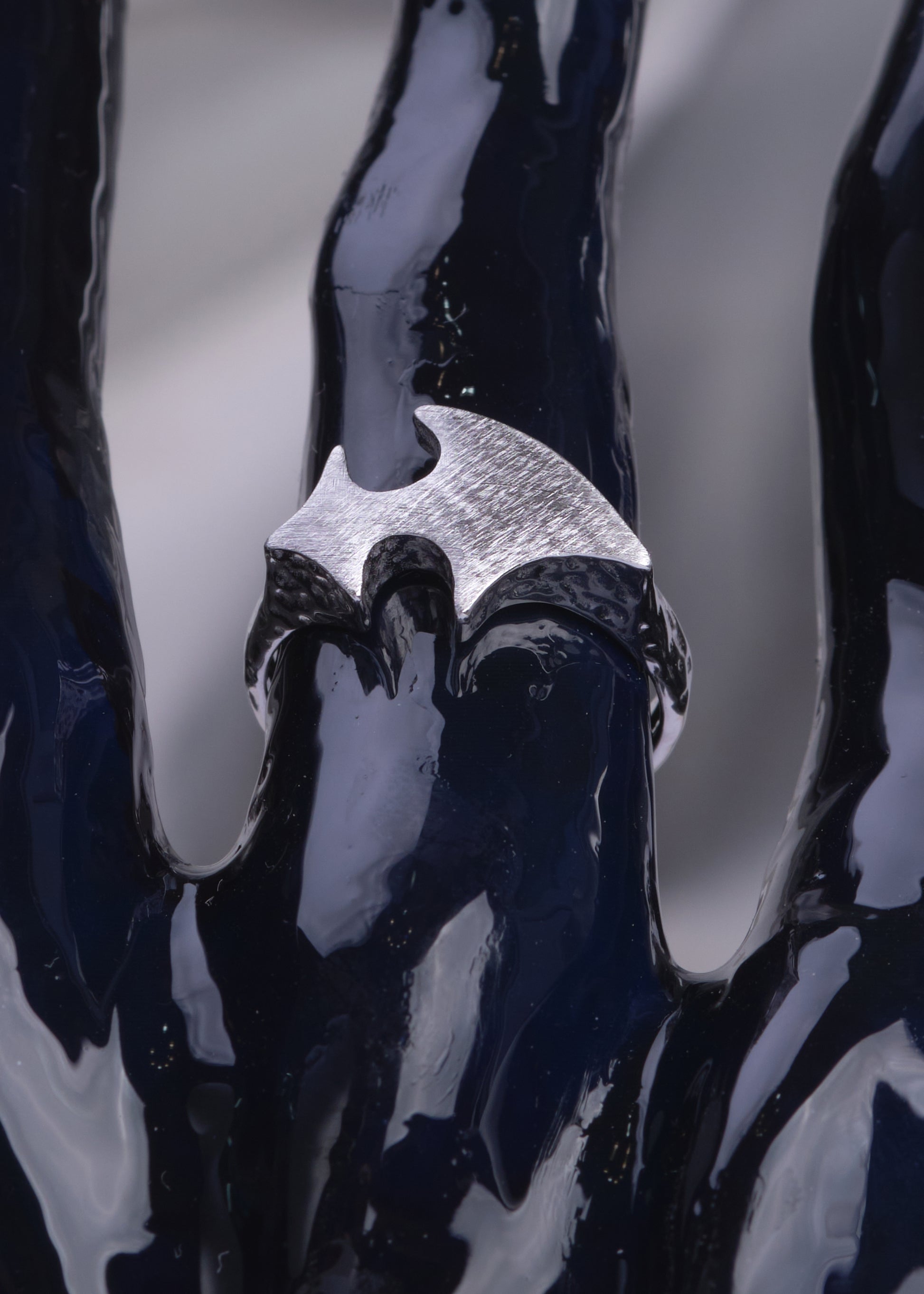 The shape of this signet type ring is retrieved from a medieval European battle axe. Those days weapons were such a big part of human lives so they were created as beautiful as jewelry. Artists and craftsmen worked on exquisite shapes and ornaments for axes and knives. We decided to use some of their effort and transform a beautiful axe shape it into something peaceful. So this is our Make Jewelry Not War statement.