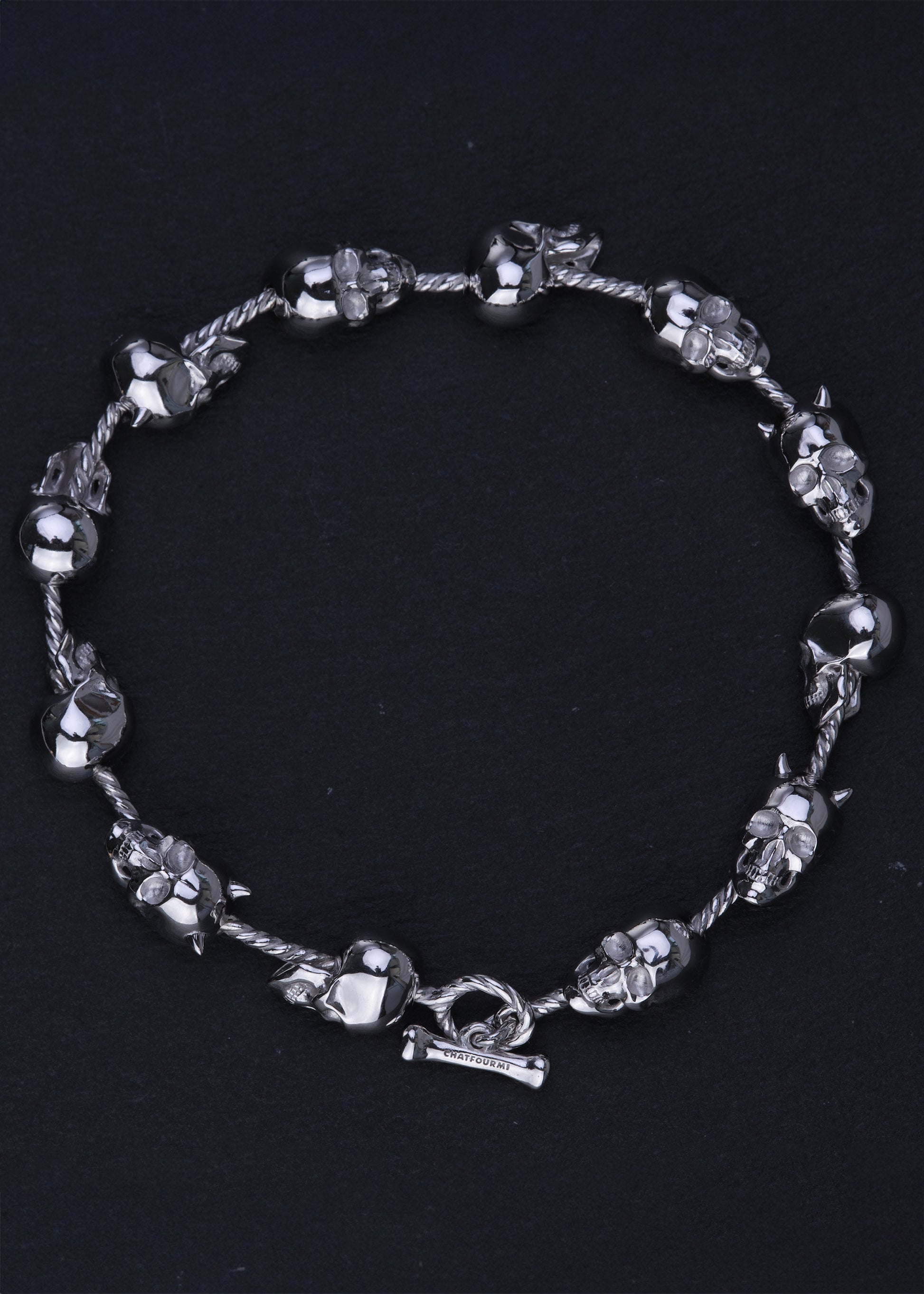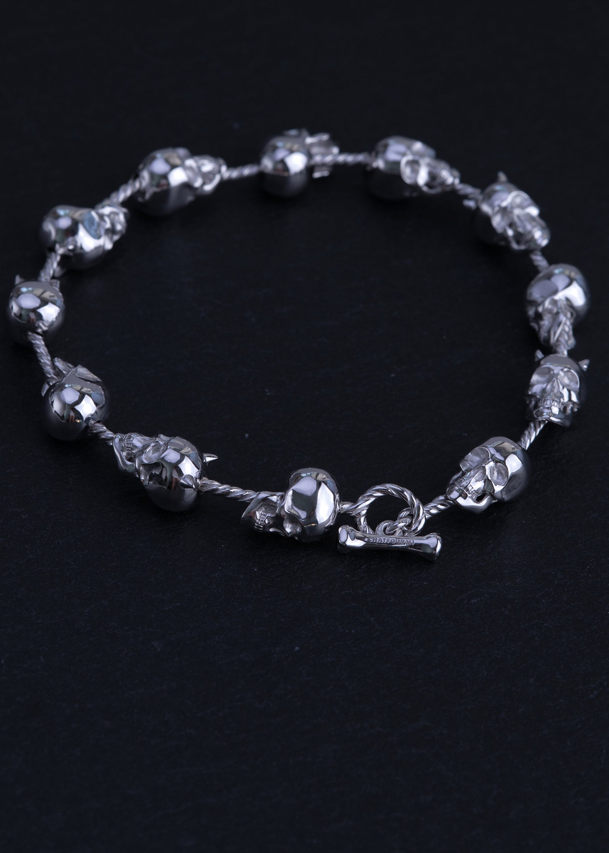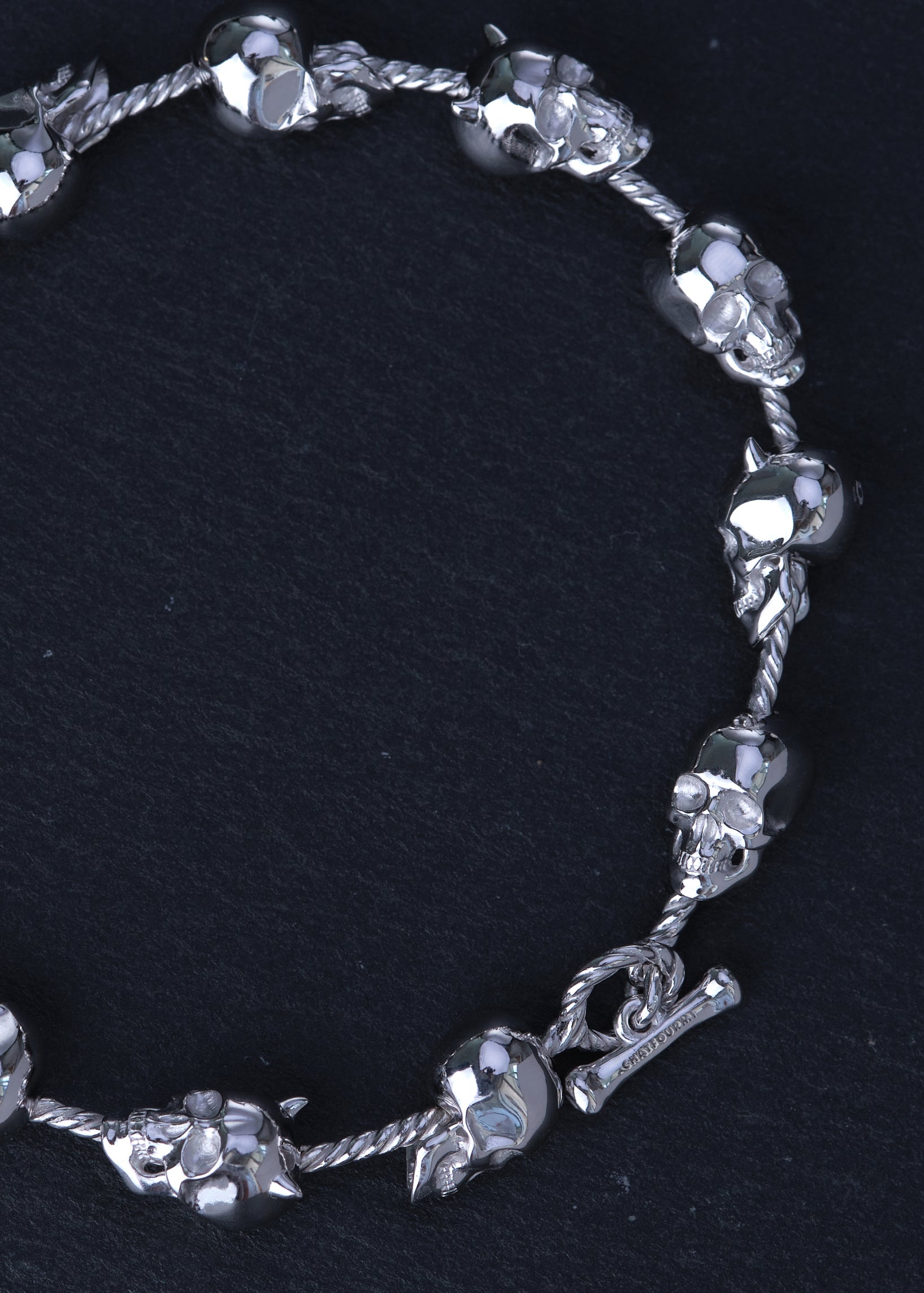 The skull motif is quite popular in jewelry, but what sets our bracelet apart is that all the connections are neatly hidden inside the skulls, making them resemble round beads on a rope.
