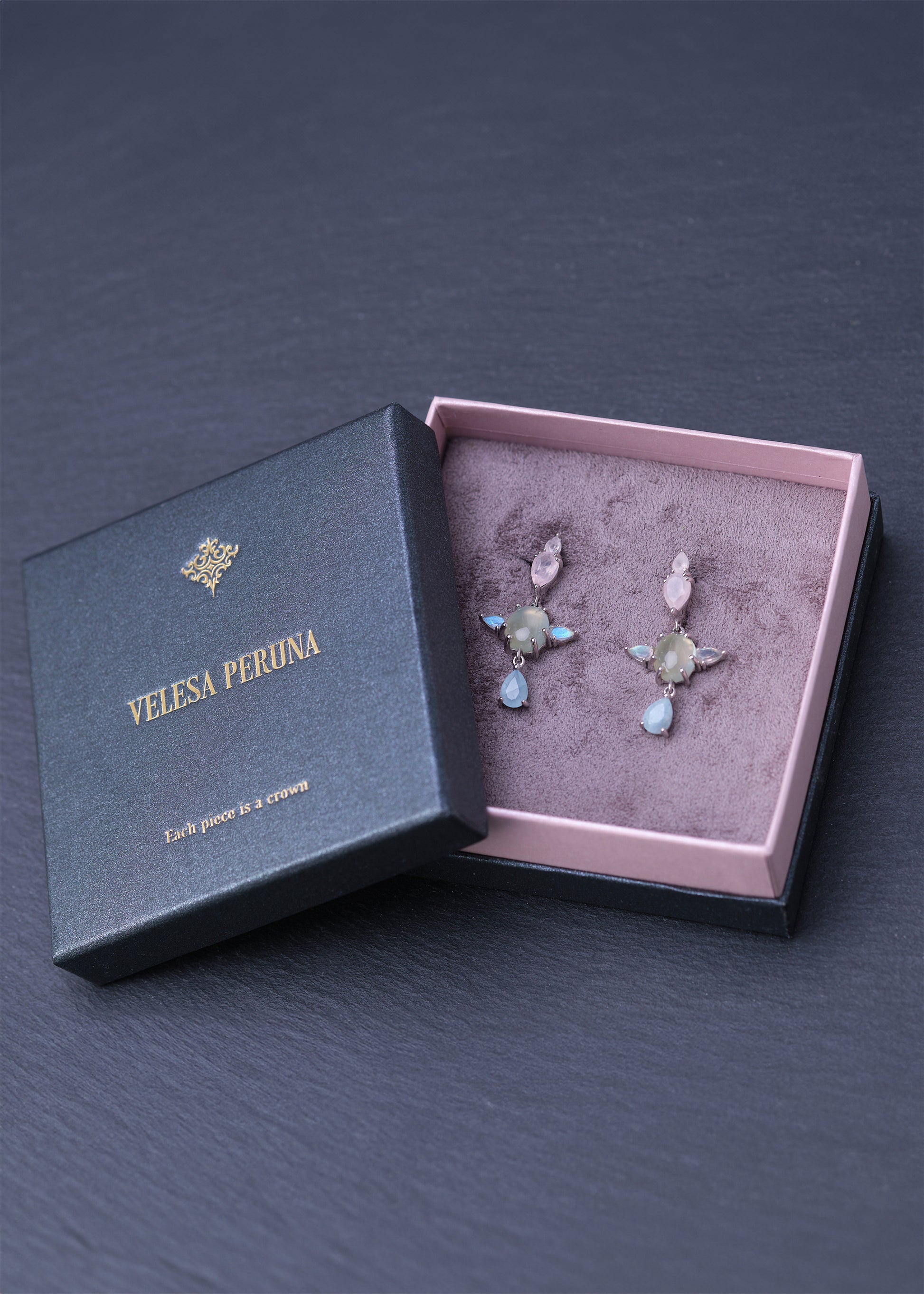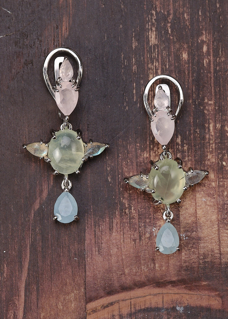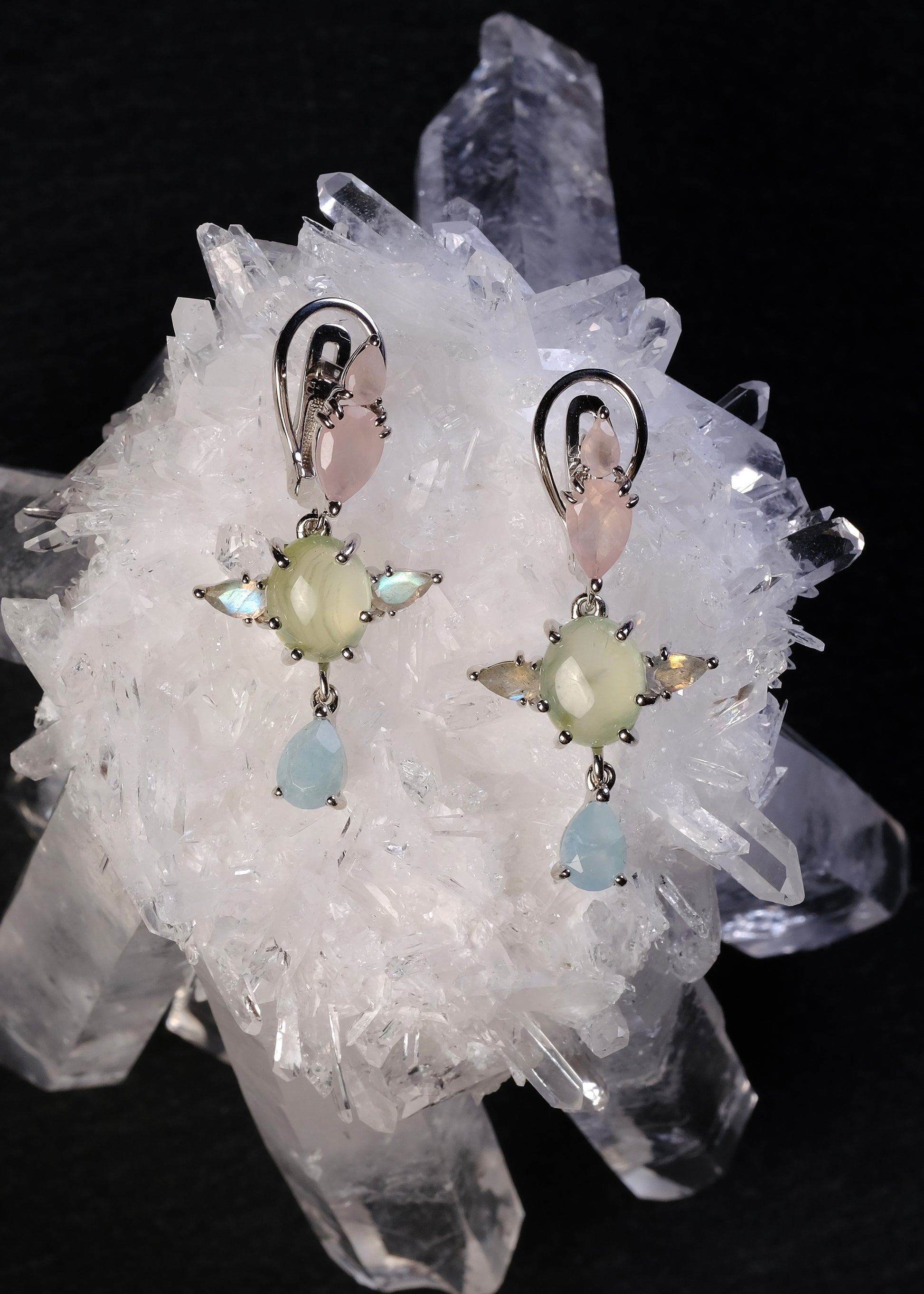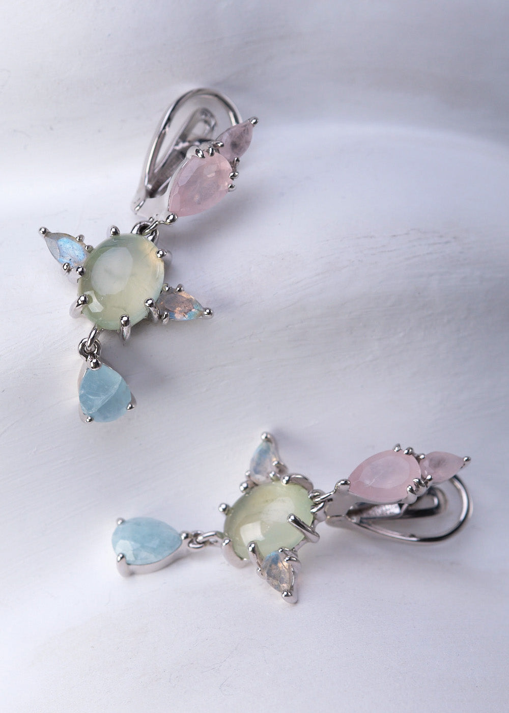 All natural stones: Prehnite cabochons, rose quartz, blue labradorite, milky aquamarine.