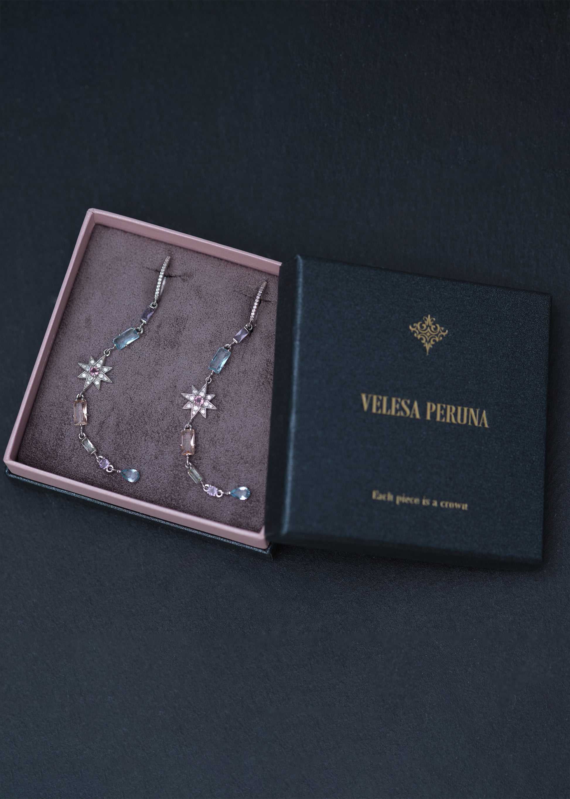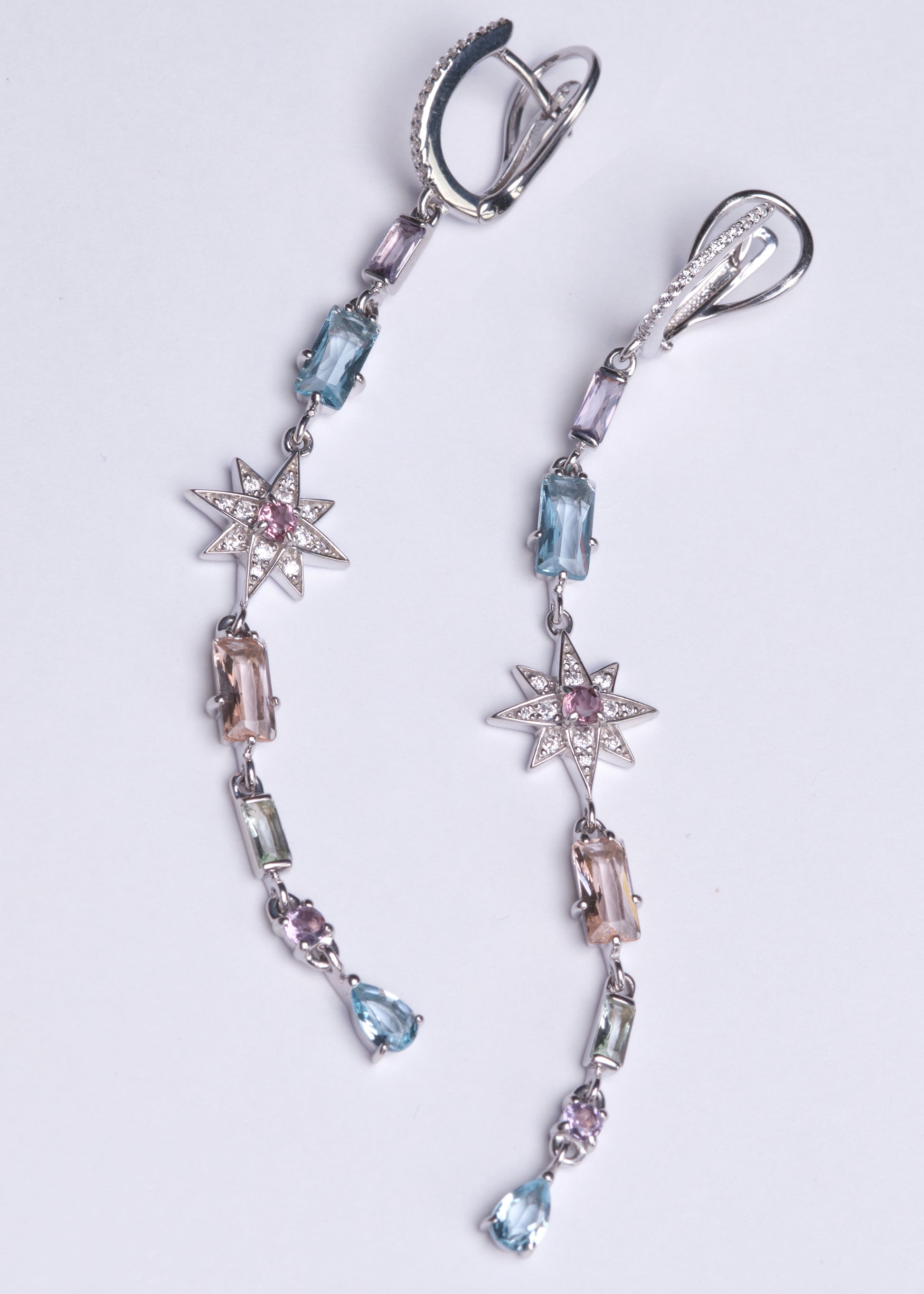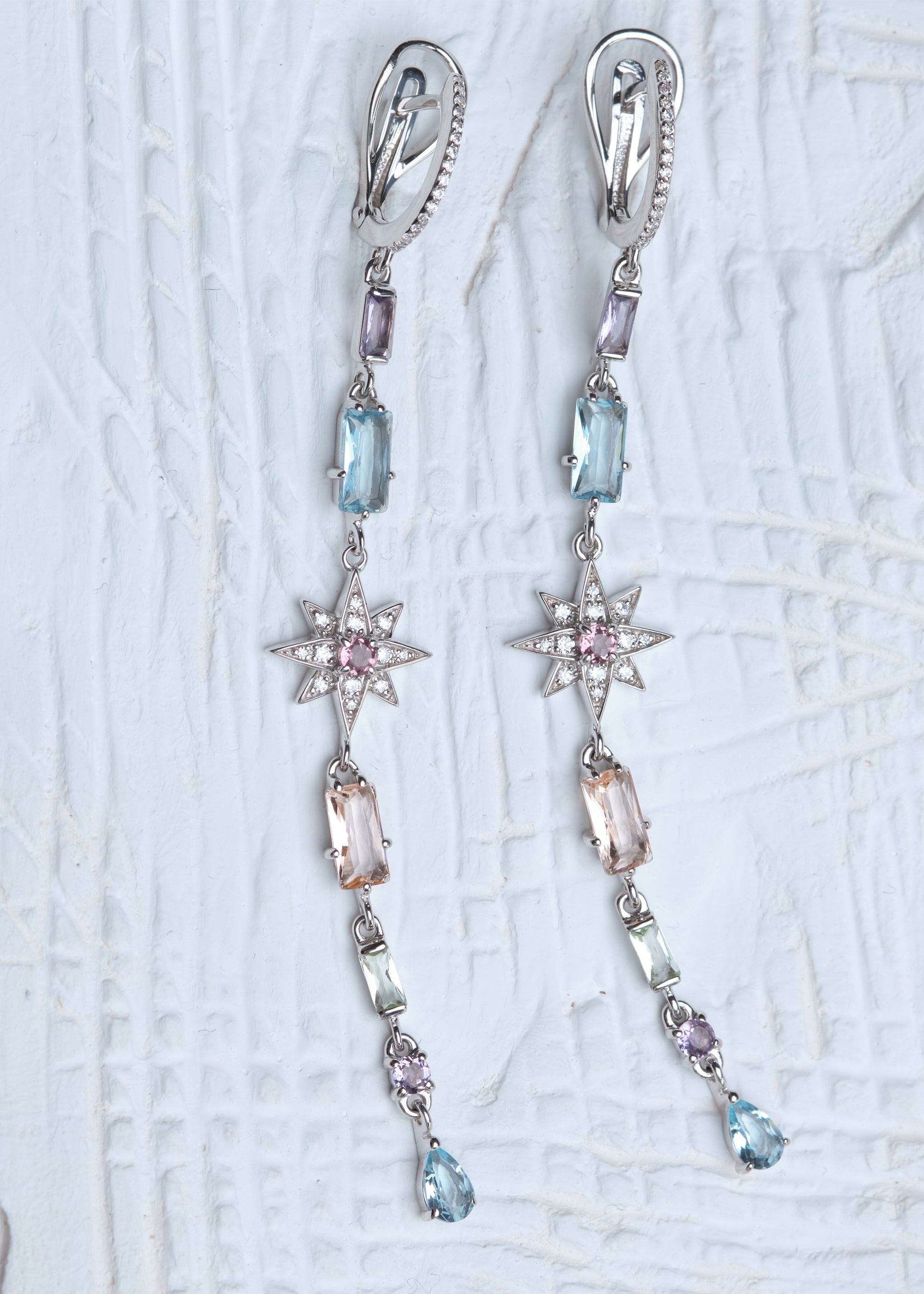Long dangle earrings, refined yet eye-catching. Delicate pastel colors.
