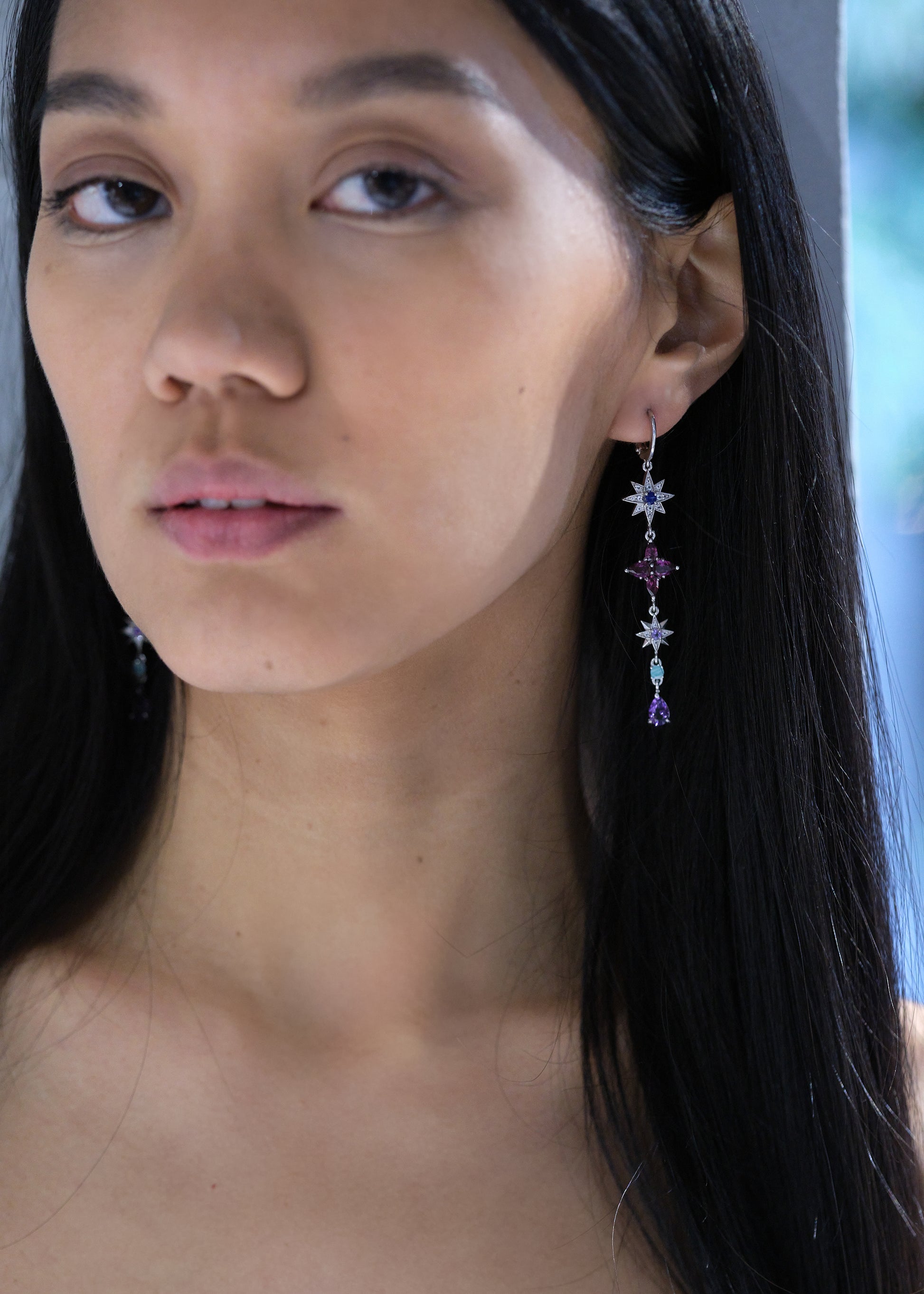 Long, movable earrings crafted from 925 sterling silver, plated with platinum and rhodium for lasting protection against oxidation.