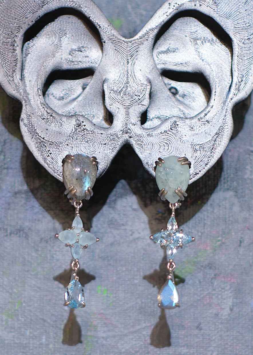 All natural stones: labradorite cabochon, milky aquamarine faceted cabochon; blue topaz, labradorite and milky aqua pear cut. Inverse asymmetry in color.