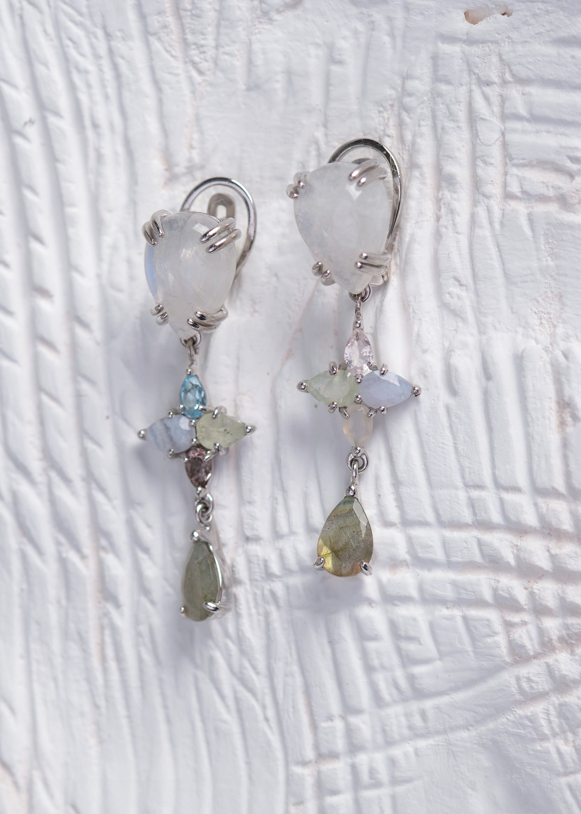 All natural stones: rainbow moonstone cabochons, prehnite, tourmaline , blue lace agate, blue topaz, chalcedony, labradorite.