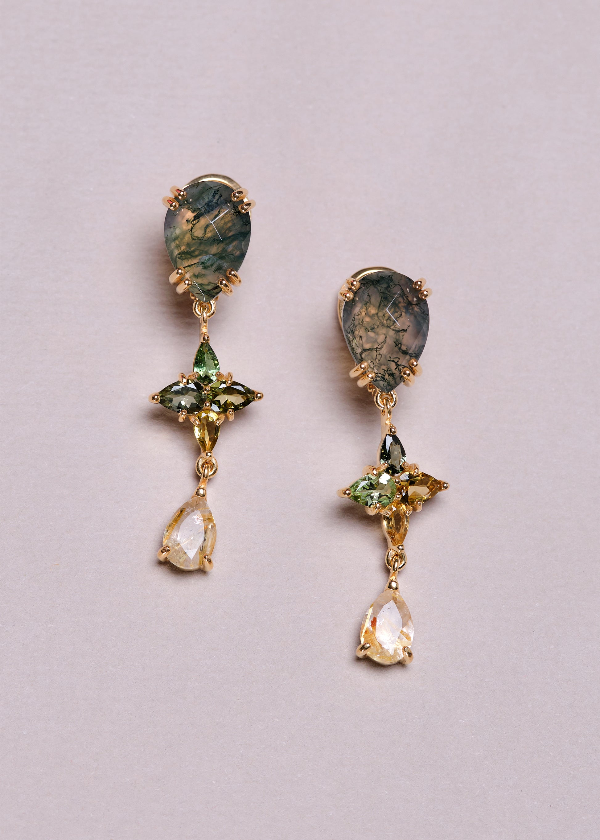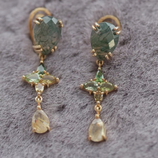 All natural stones: moss agate faceted cabochons, tourmaline , gold rutile quartz.
