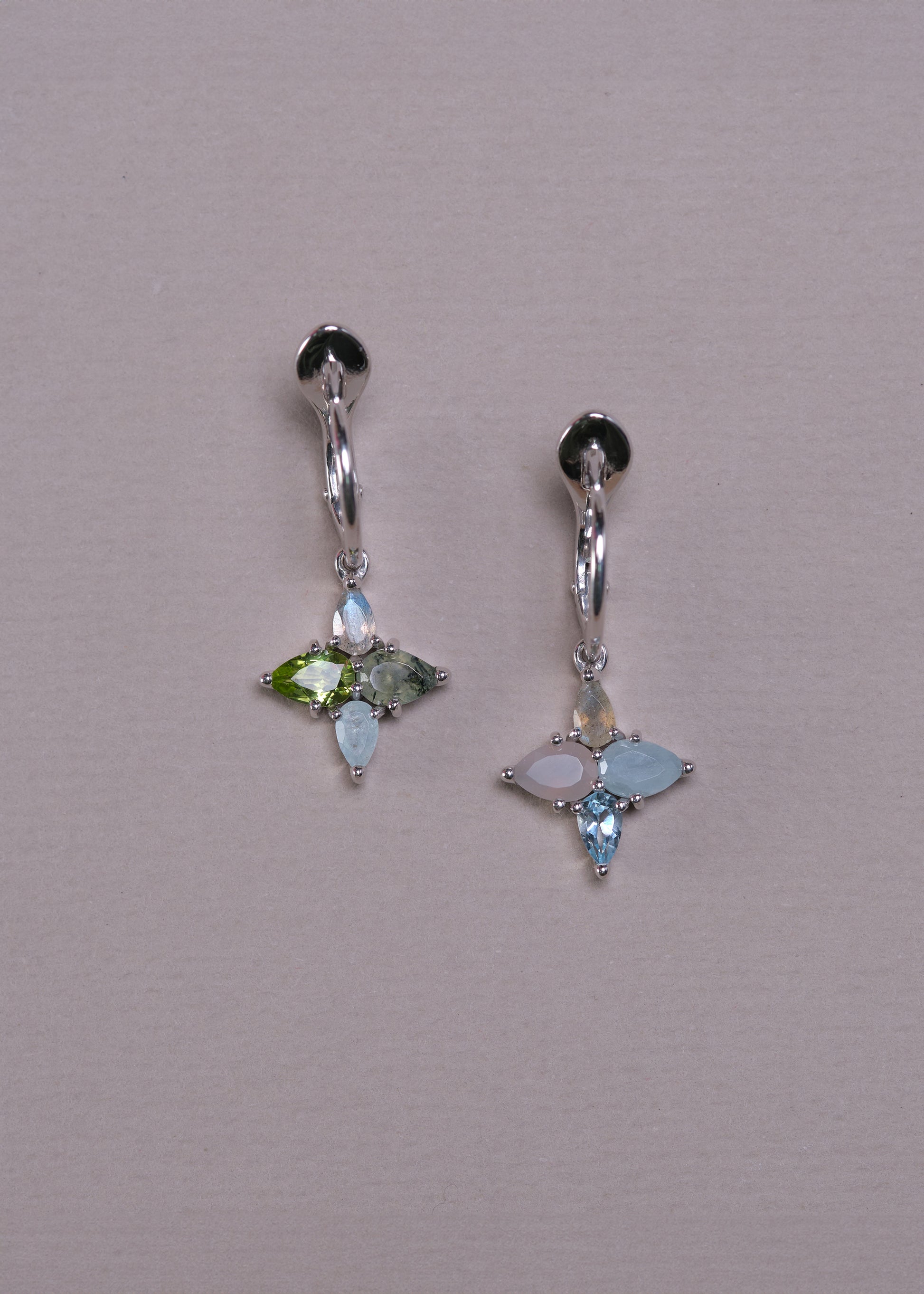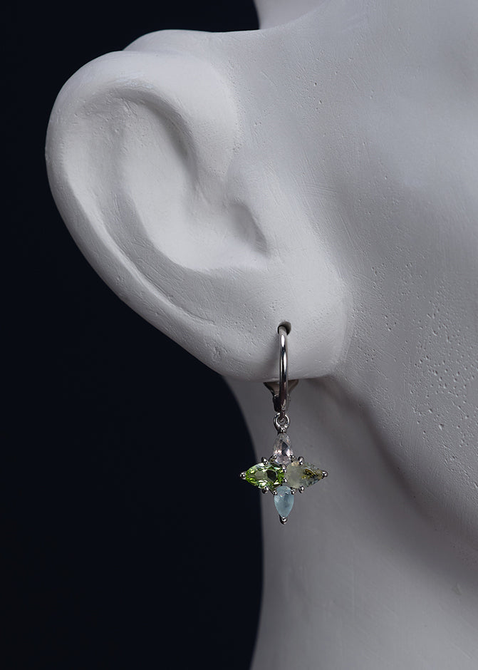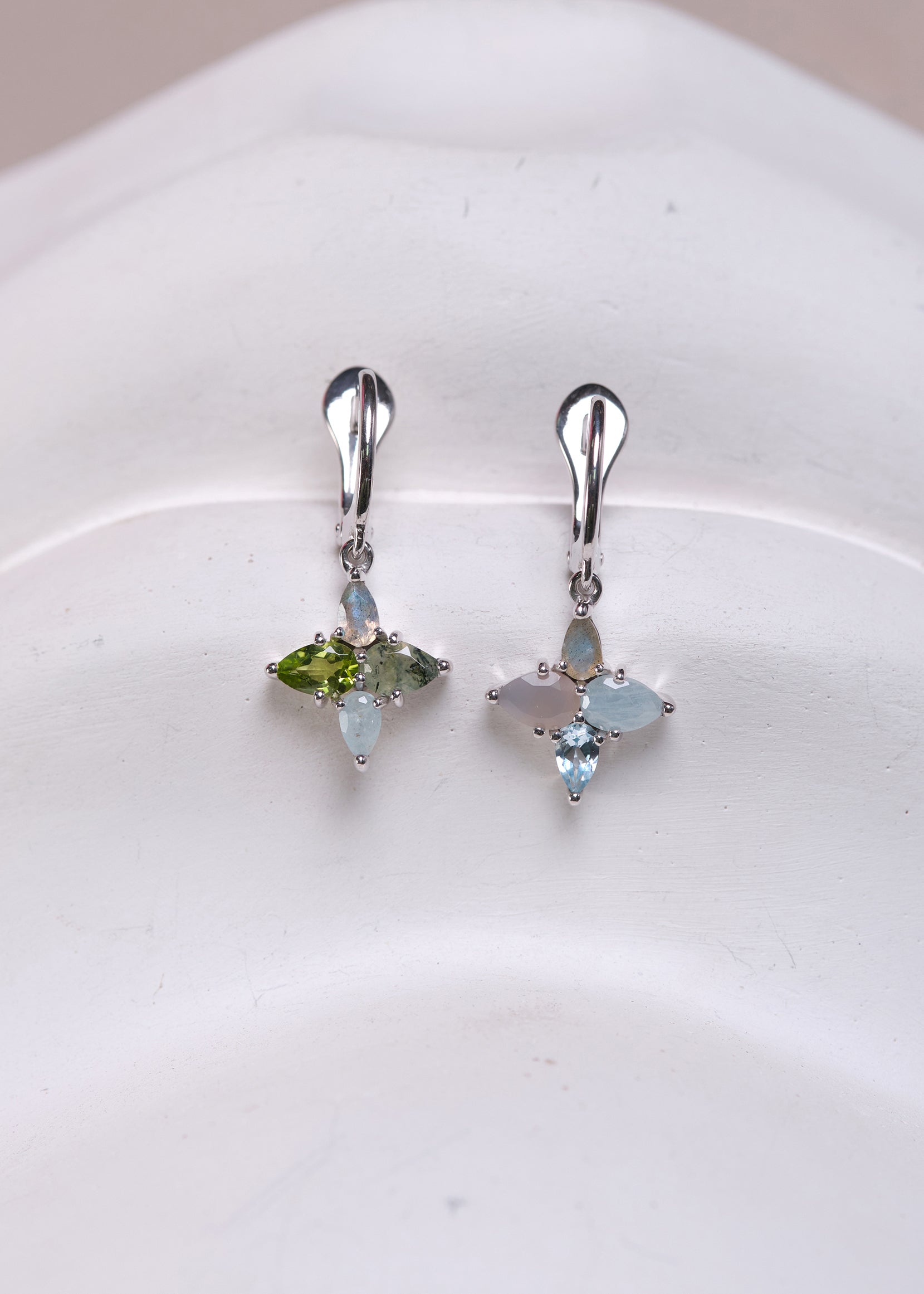 All natural stones: Peridot, rainbow moonstone, milky aquamarine, labradorite, prehnite, chalcedony, blue topaz. Asymmetry in color.