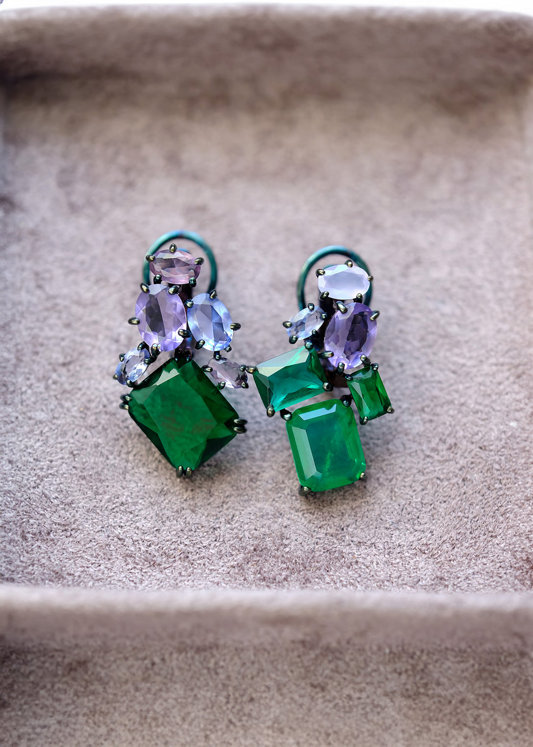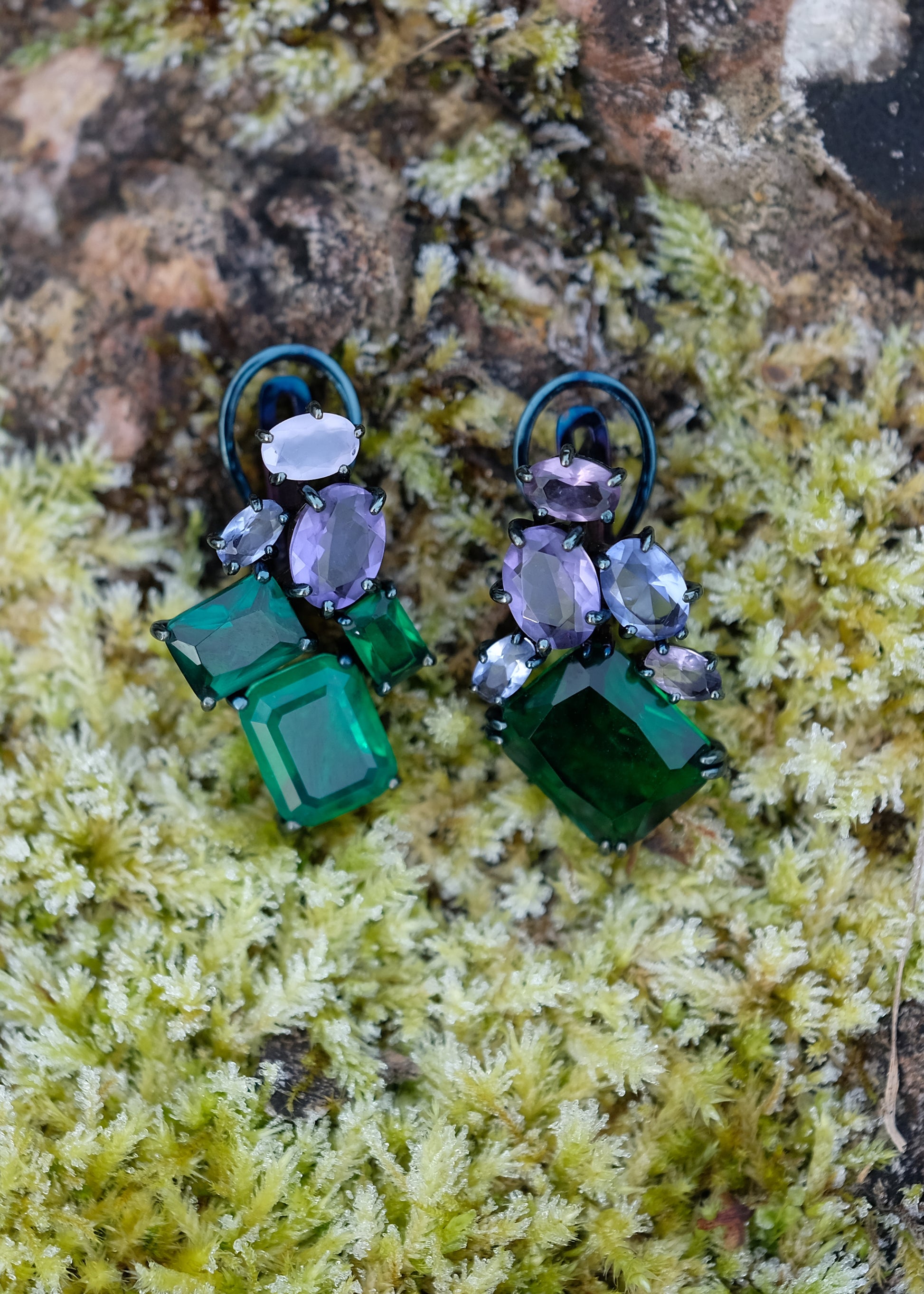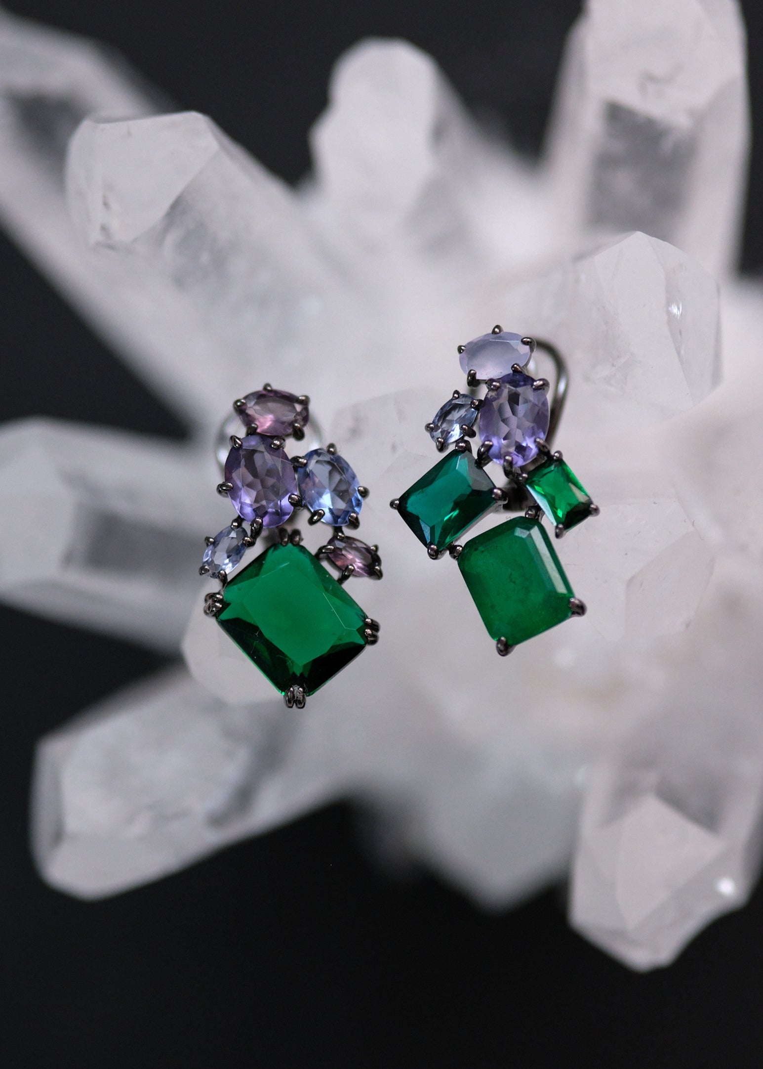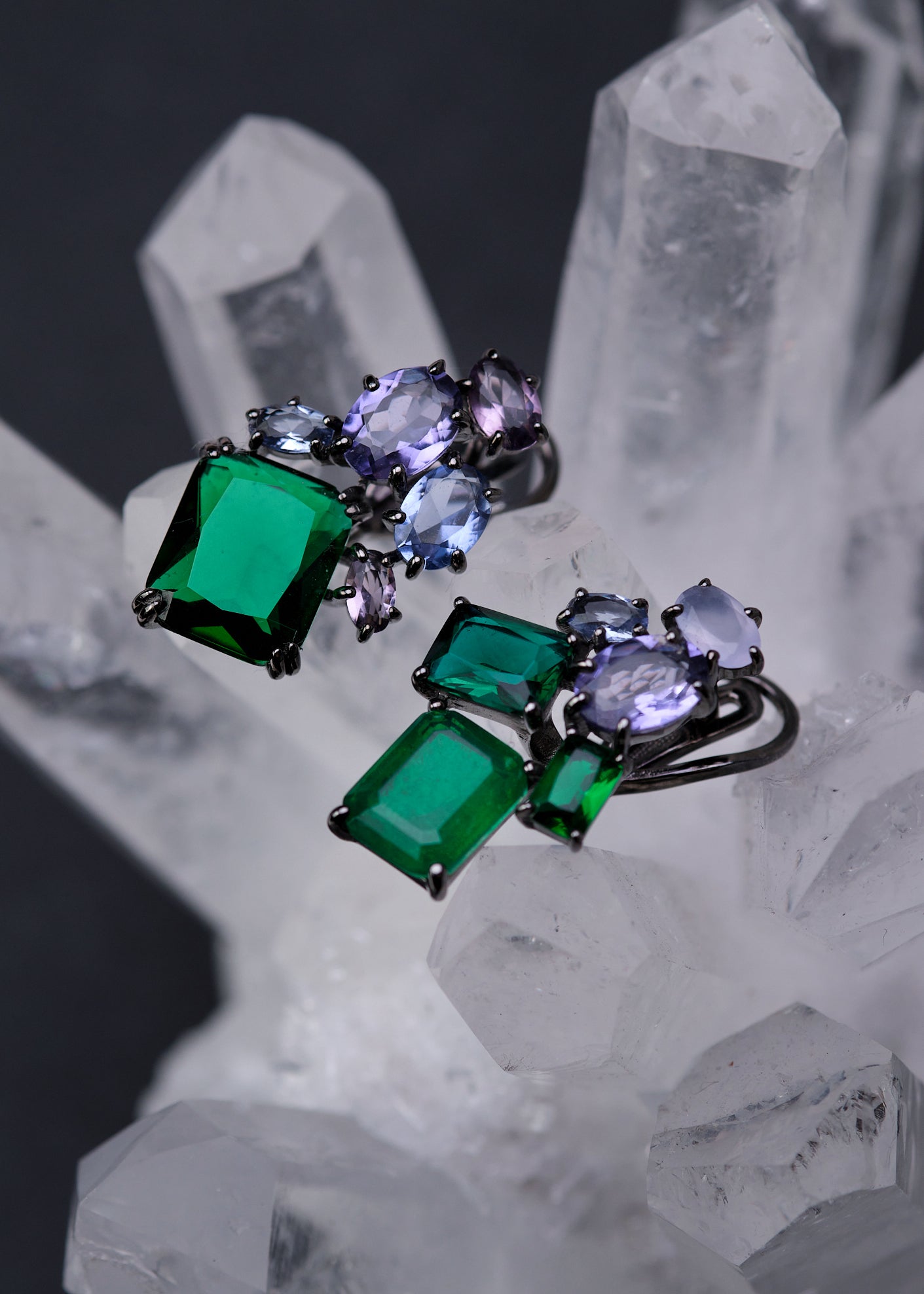 Sterling silver, black rhodium plated. Synthetic quartz crystals.