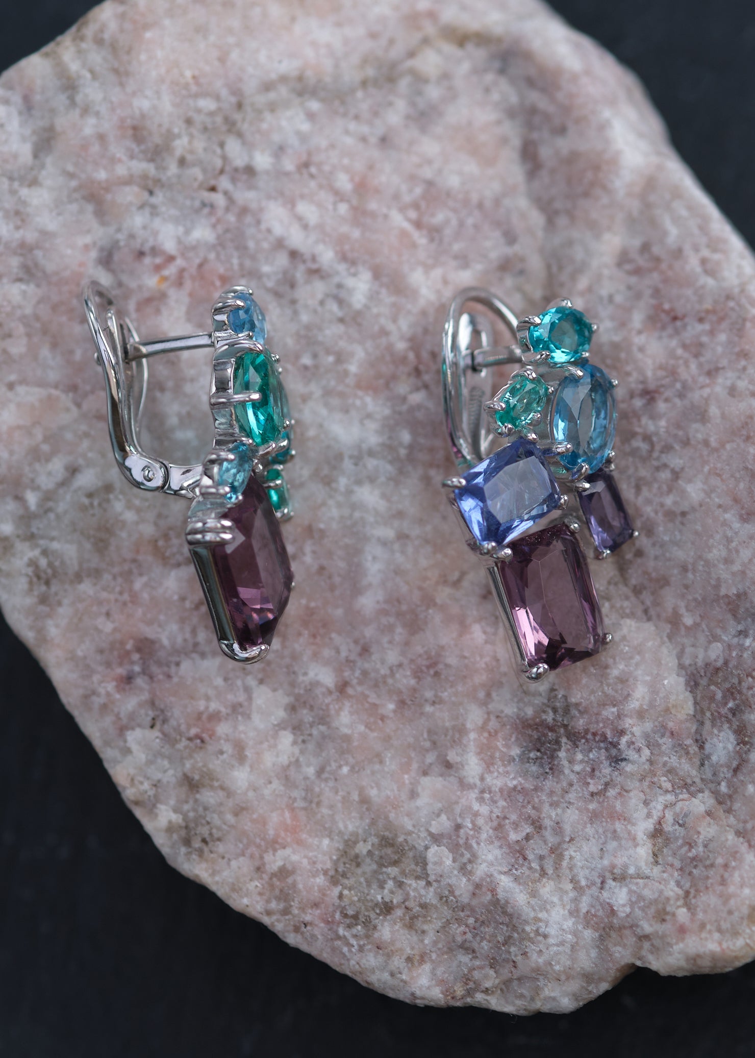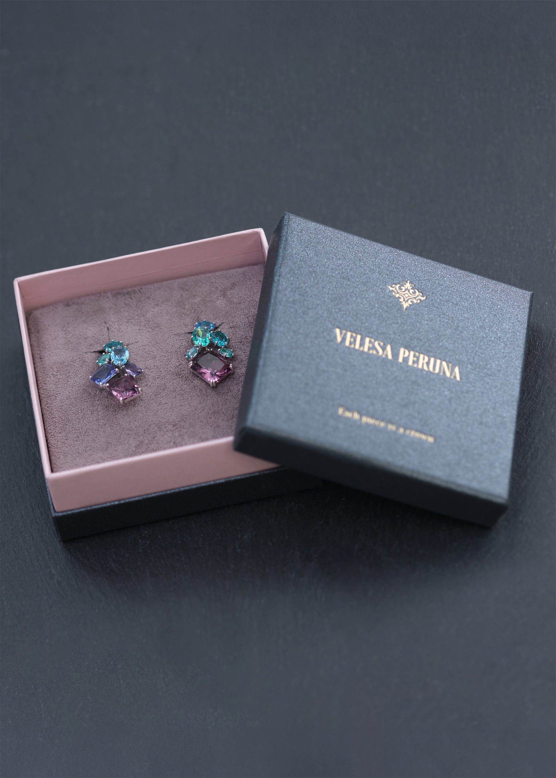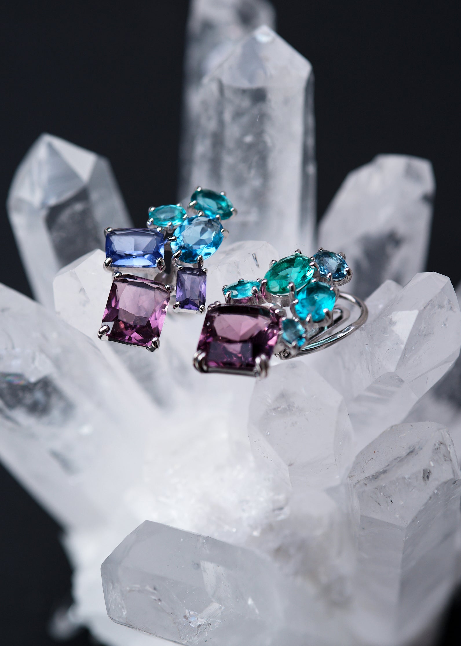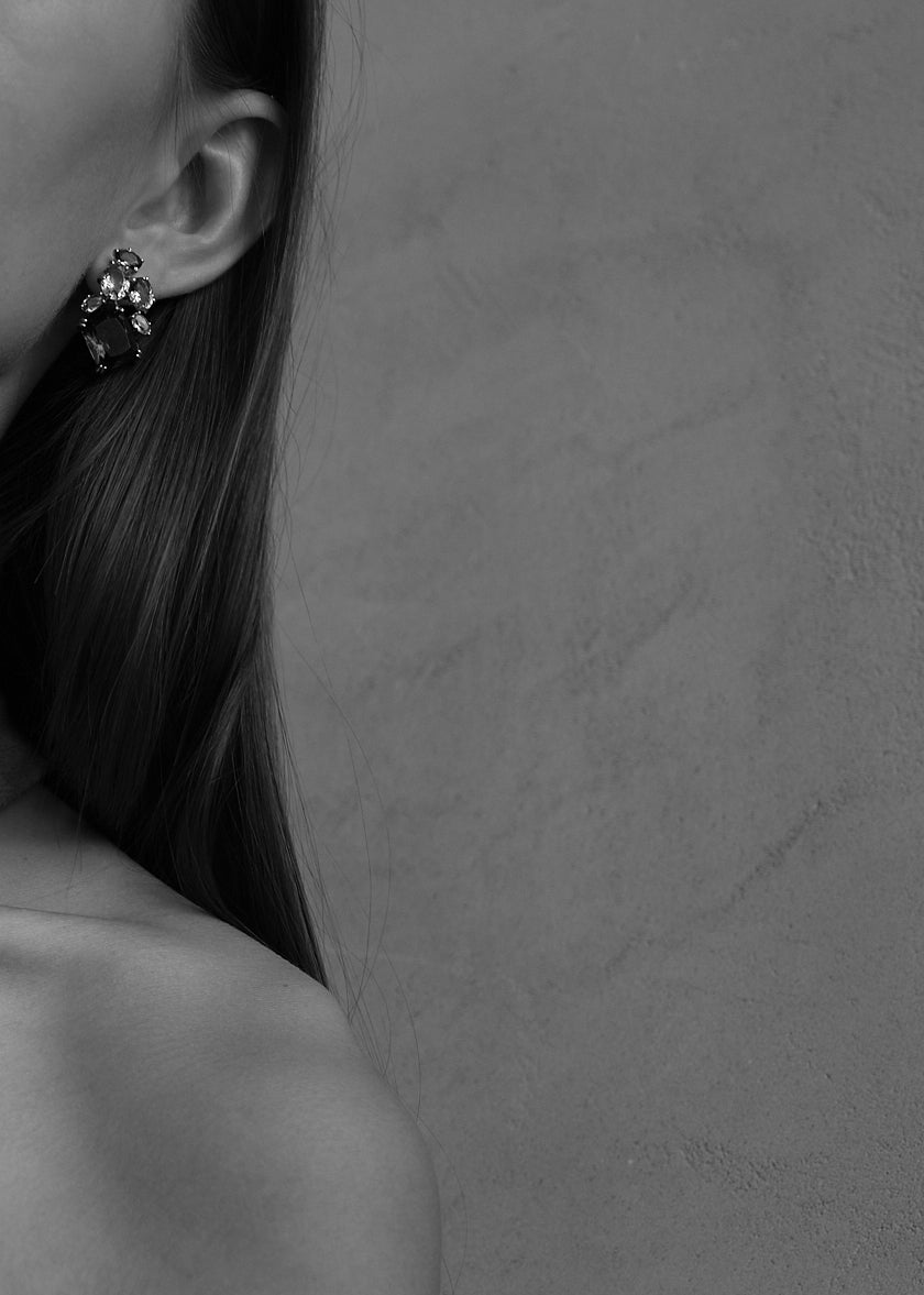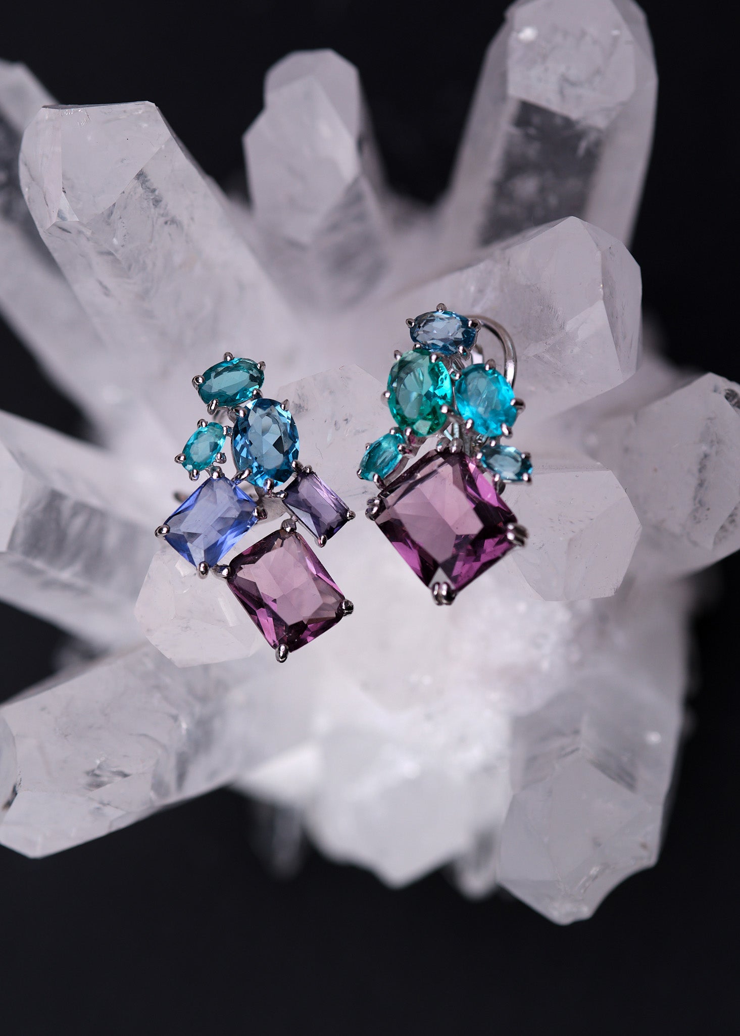 Sterling silver, black rhodium plated. Synthetic quartz crystals.